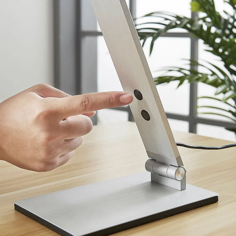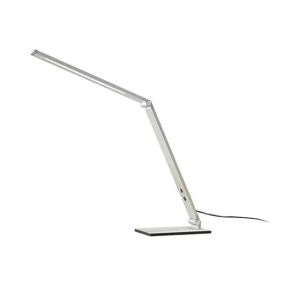 Modern ogende LED bureaulamp Nicano van aluminium, lichtkleur en lichtsterkte instelbaar in vier stappen Nicano is een zeer nuttige aanvulling op het bureau met een moderne uitstraling. De LED bureaulamp bestaat uit een hoekige lampvoet en twee langwerpige elementen, waarvan de bovenste het verlichtingselement is. Alle elementen zijn met scharnieren aan elkaar verbonden en kunnen dus op en neer worden bewogen zodat de richting van de lichtstraal individueel kan worden bepaald. De lichtkleur en de helderheid van de LED’s kunnen ook worden aangepast, waarbij telkens vier niveaus mogelijk zijn.