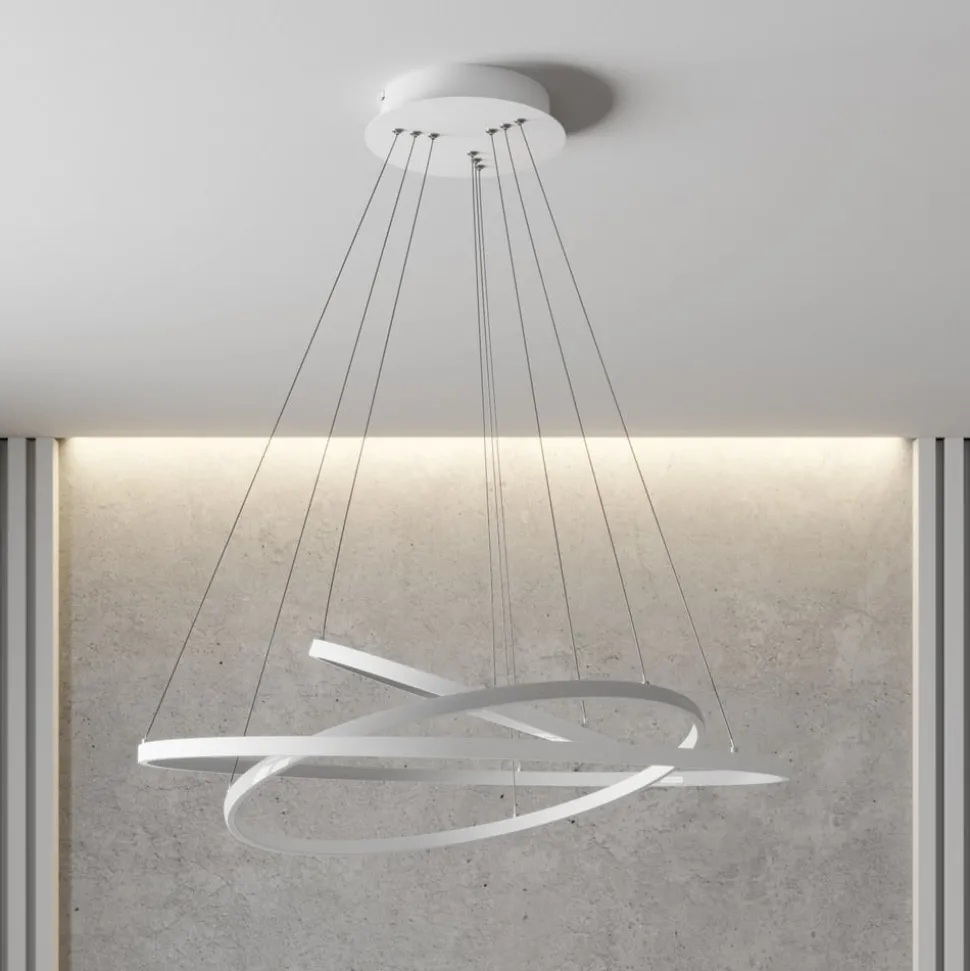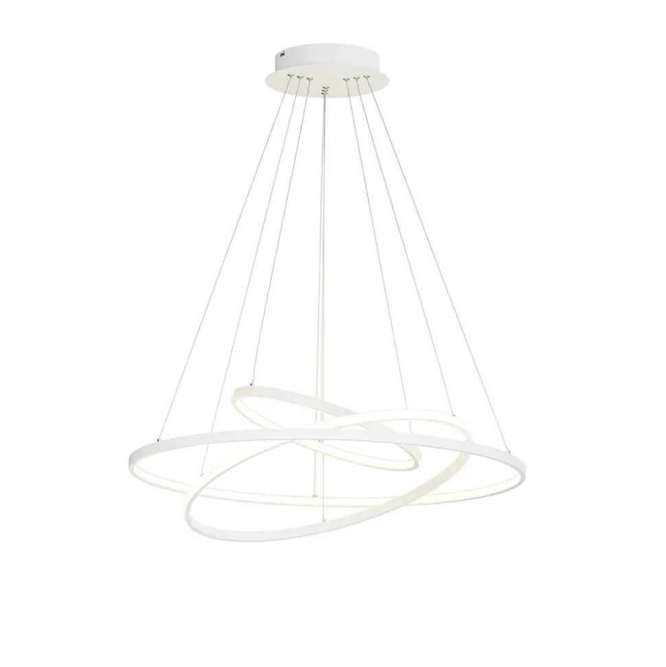 LED hanglamp Ezana in wit De LED hanglamp Ezana is het middelpunt van elk interieurontwerp dat gebruik maakt van heldere vormen. Ze combineert een uitzonderlijk design met een warme en dimbare lichtsfeer. De ophanging van de hanglamp is volledig in wit en combineert metalen en kunststof elementen voor een harmonieuze totaallook. Hierdoor kan de lamp elegant worden geïntegreerd in moderne inrichtingsstijlen. Drie lichtringen zijn bevestigd aan de pendelpoten, die in elkaar grijpen als planetaire ringen. Ze creëren een subtiel spel van licht en schaduw dat gemakkelijk in vier fasen kan worden gedimd met de dimmerfunctie op de wandschakelaar.