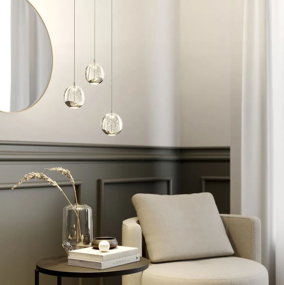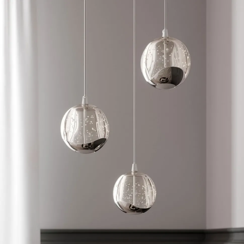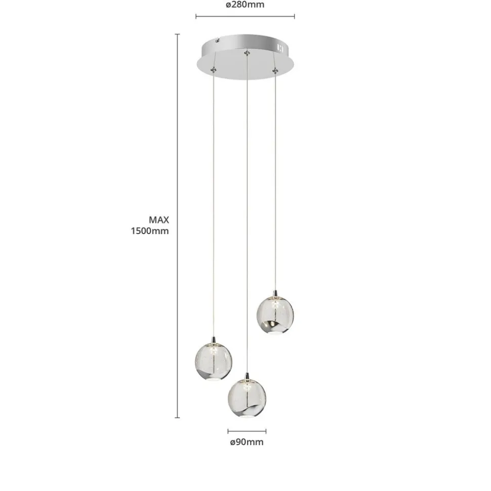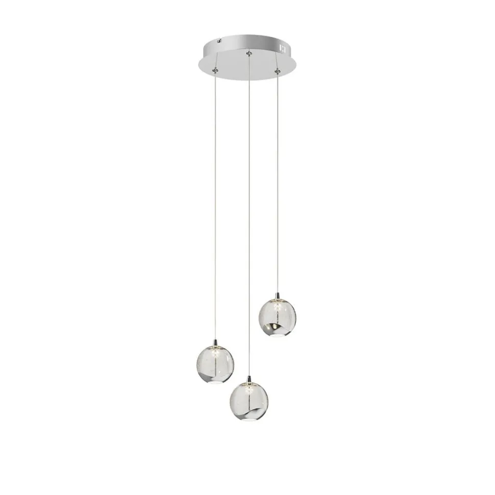 3-lamps LED hanglamp Hayley met speciale lichteffecten en bolvormige glazen kappen Hayley is een energiebesparende LED hanglamp met decoratieve elementen in chroom en drie glazen kappen met een decoratieve bellenstructuur die unieke lichteffecten creëert. Het glanzende chroom ziet er bijzonder elegant uit, net als de kappen met hun bubbels. Dit maakt Hayley tot een armatuur met een hoge glamourfactor, waarvan de 3-lamps versie bijzonder geschikt is voor gebruik boven de eettafel. Het licht wordt zowel direct als indirect uitgestraald en waar je het directe lichtcomponent ziet, is er een wit glazen element voor een zachte lichtverdeling, terwijl de rest van de glazen kap wordt gekenmerkt door het aantrekkelijke bubbelglas, dat helder en stralend is.