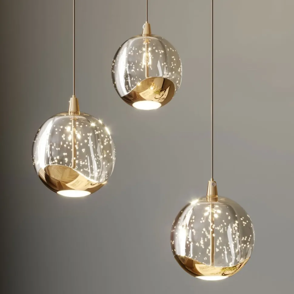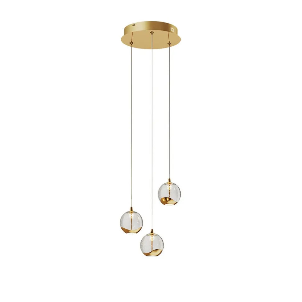 Hayley LED hanglamp met drie glazen bollen en metalen elementen in glanzend goud De 3-lamps versie van Hayley past goed boven een eettafel en maakt indruk met een speciale glamourfactor, die wordt gevormd door het stralend sprankelende bubbelglas en de metalen elementen in goud. De kappen hebben een compact ontwerp en zijn allemaal bolvormig. Het grootste deel is gemaakt van het aantrekkelijke bubbelglas, maar aan de onderkant zit een metalen element in een glanzende goudtint, terwijl de directe lichtuitstraling aan de onderkant zachter en gelijkmatiger is dankzij een element van wit glas, dat nauwelijks schittering creëert. Een echte HighLight met opvallende kwaliteiten!
