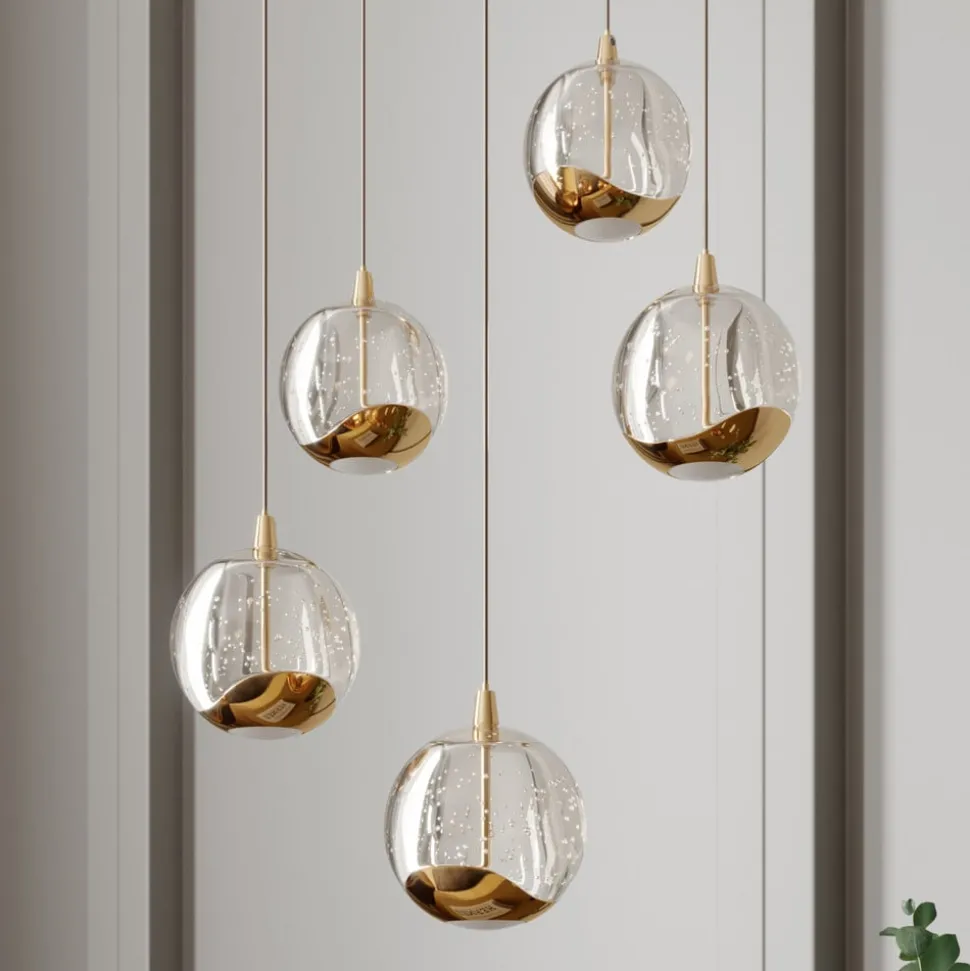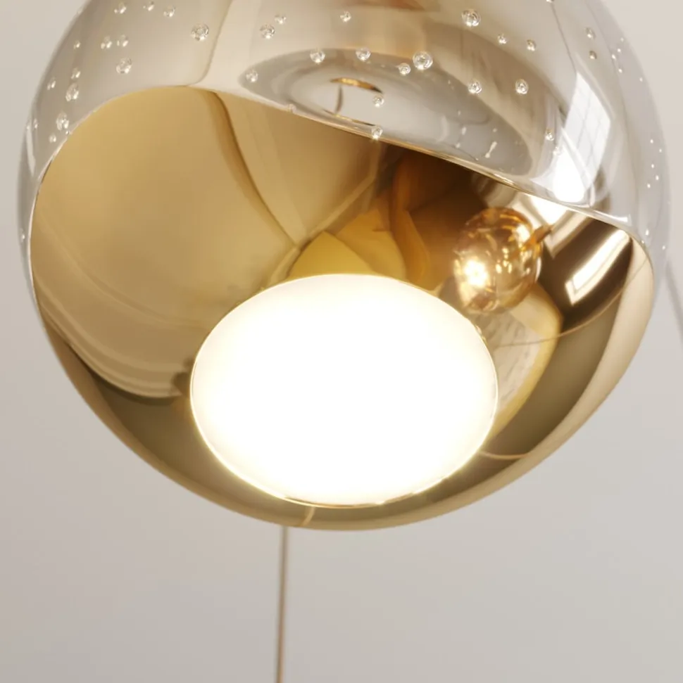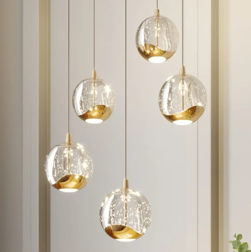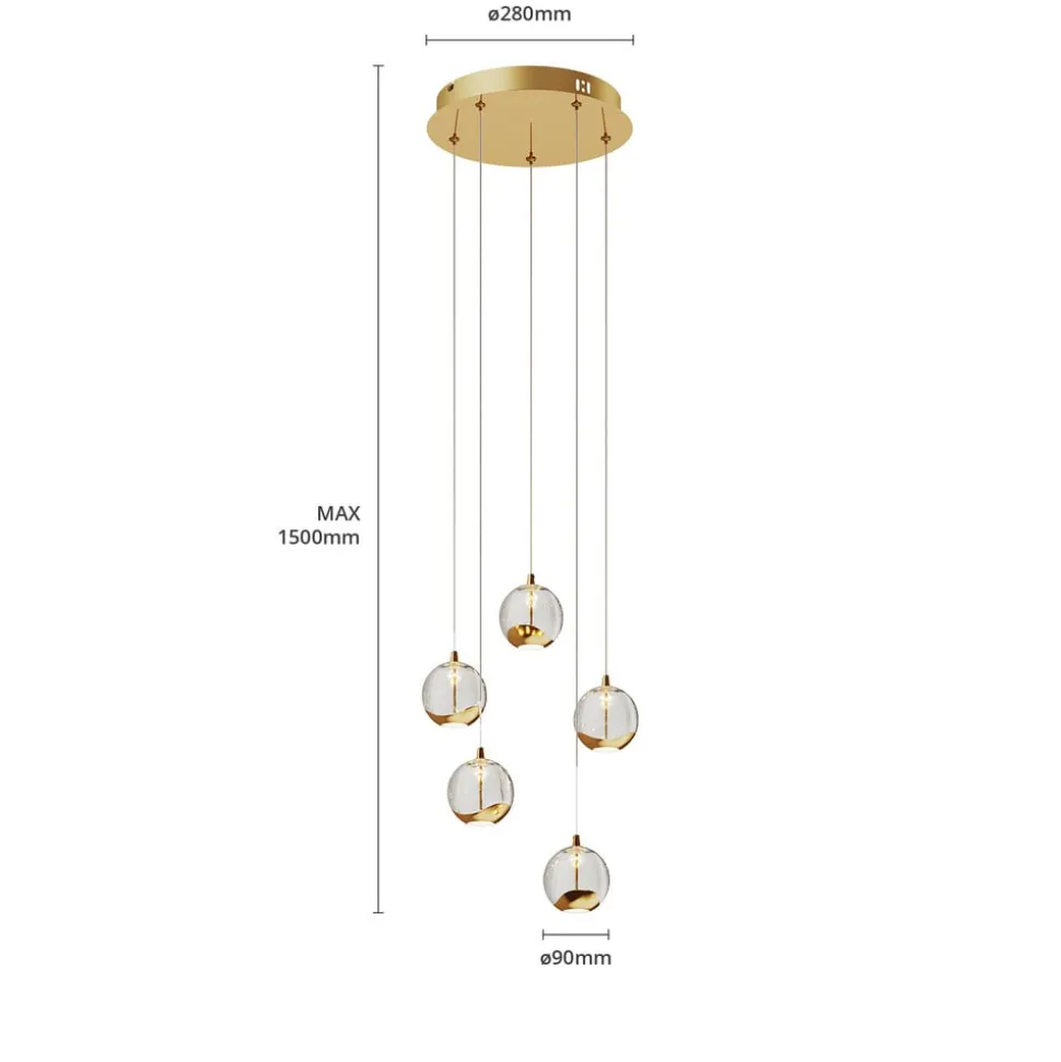 Goudkleurige LED hanglamp Hayley met vijf glazen bollen met aantrekkelijke bubbels Hayley is een hanglamp met stijl en gratie die niet zal misstaan in klassieke interieurs dankzij de goudkleurige metalen elementen. De vijf kappen zijn gemaakt van helder glas met een bellenstructuur en zijn aan de onderkant afgewerkt met het goudkleurige metalen decor. Ze stralen het LED-licht zowel direct als indirect uit, hoewel er een wit glazen element aan de onderkant is dat het licht zachter en gezelliger doet lijken. Over het geheel genomen kan gezegd worden dat Hayley een sprankelende verlichtingservaring creëert met speciale effecten en een indrukwekkende spot. De LED-technologie zorgt voor een laag energieverbruik met een goede efficiëntie, waardoor een helder licht ontstaat. De hanglamp is de ideale aanvulling op de verlichting van de eetkamer.
