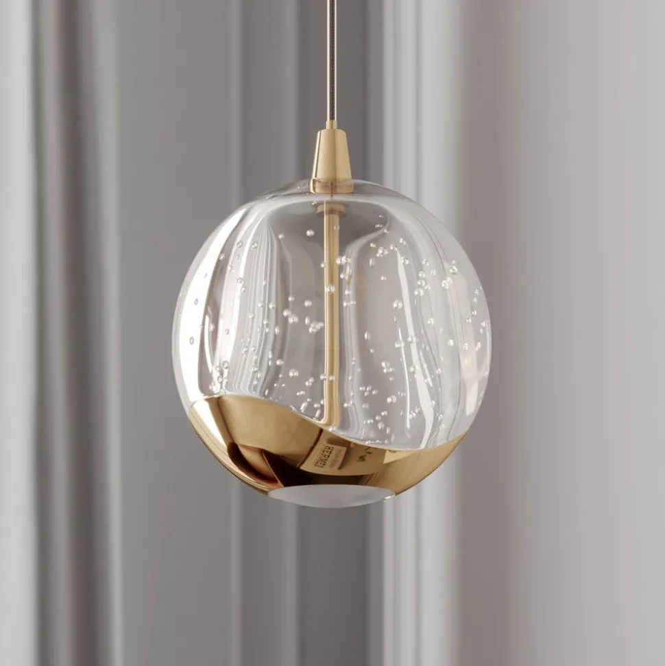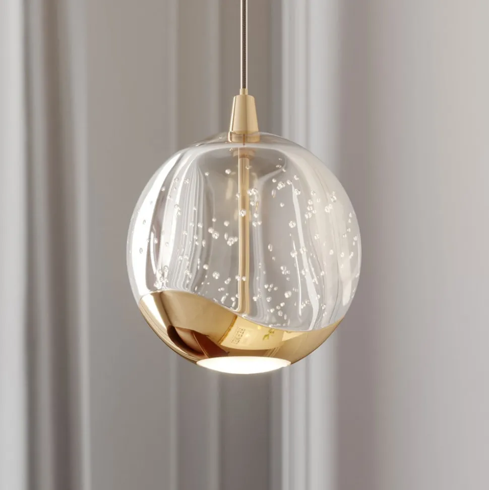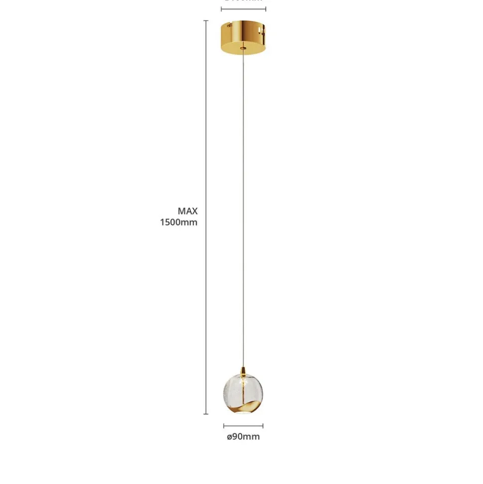 Bolvormige LED hanglamp Hayley met goudkleurige elementen en een glazen kap met bubbelstructuur Hayley heeft een opvallende uitstraling en is een compacte LED hanglamp die in verschillende woonkamers kan worden gebruikt, waar het een decoratieve blikvanger wordt. Je kunt ook meerdere lampen achter elkaar gebruiken, bijvoorbeeld om een toonbank te verlichten. De LED’s zijn zowel efficiënt als energiebesparend, wat resulteert in een goede helderheid met een laag energieverbruik. De glazen bol heeft een interessant oppervlak met een bellenstructuur en aan de onderkant zit een metalen element dat, net als de plafondhouder, is afgewerkt in een glanzende goudtint, wat de hanglamp een klassieke uitstraling geeft. De lichtuitstraling is niet alleen direct maar ook indirect, waarbij de directe lichtcomponent zo zacht en gezellig mogelijk lijkt dankzij een wit glazen element.