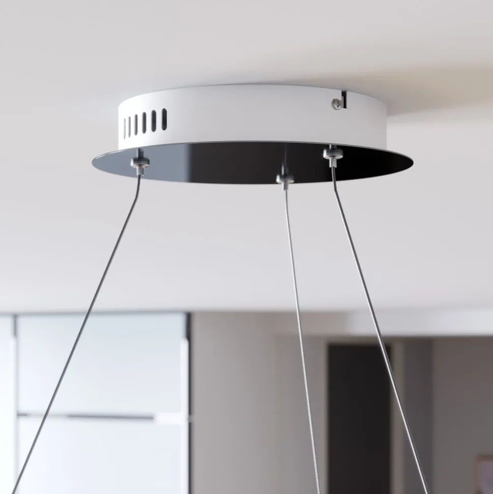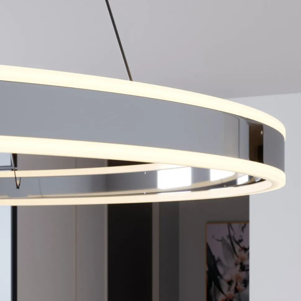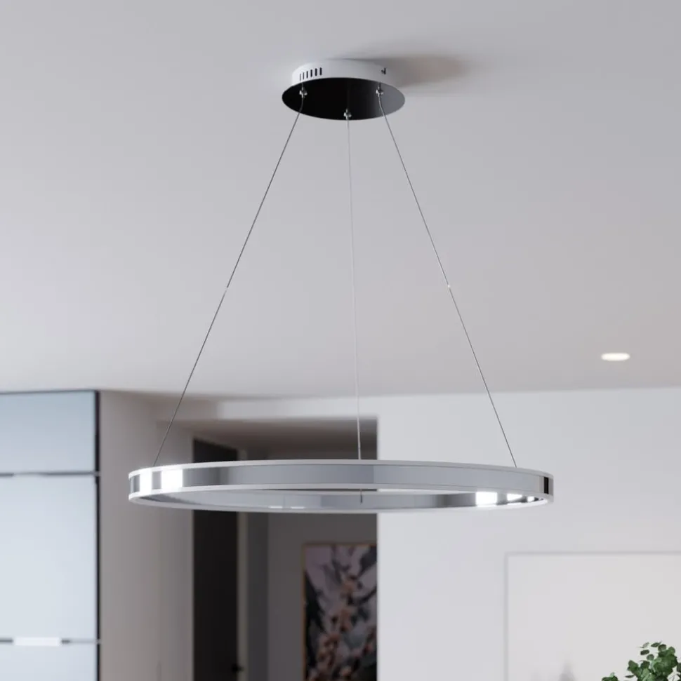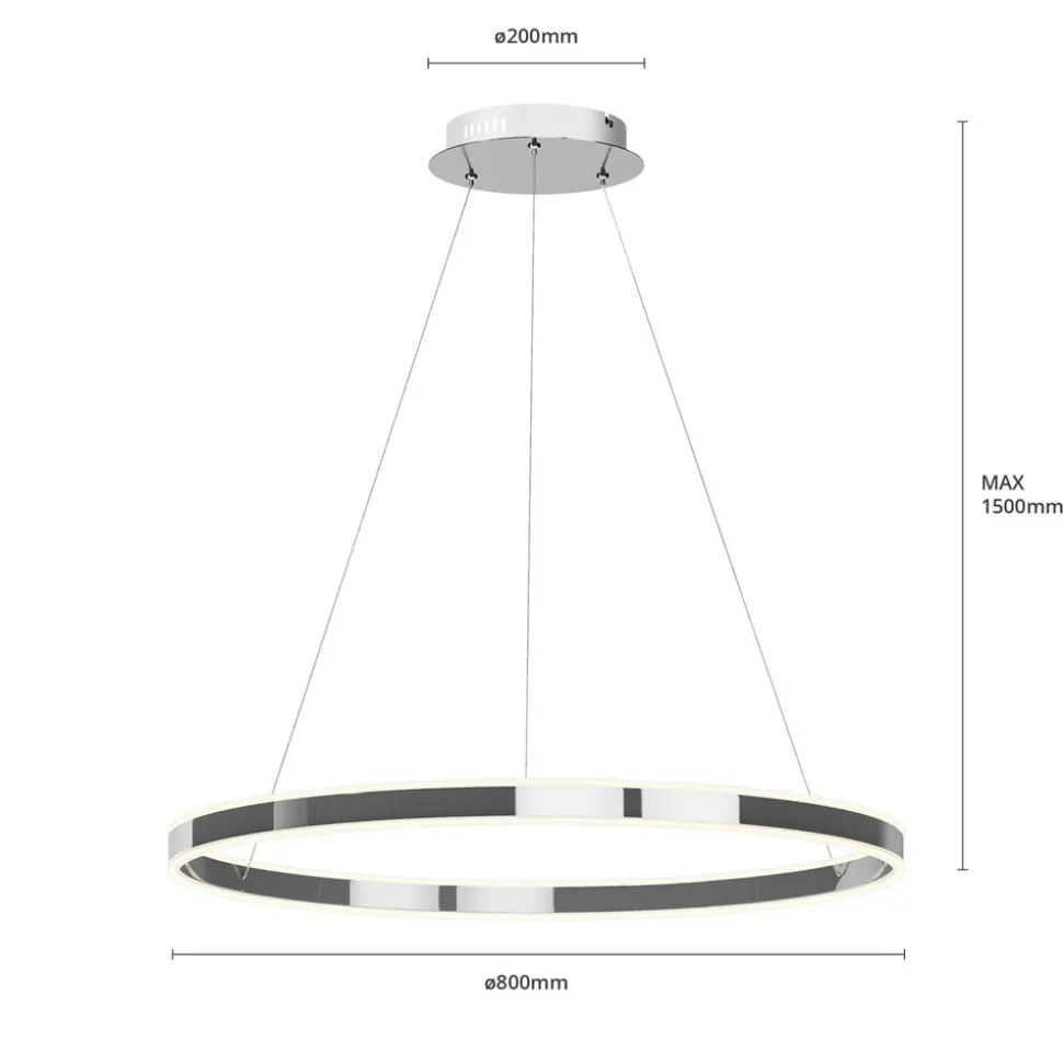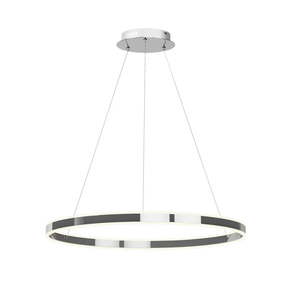 Grote LED hanglamp Lyani in een klassieke ringvorm met een glanzend chromen afwerking, dimbaar via wandschakelaar Lyani is geschikt voor keukens en eetkamers en is een gedetailleerde, elegante verlichtingsoplossing voor met name moderne kamers. De helderheid van de LED’s is uitzonderlijk hoog en indien gewenst kan de wandschakelaar worden gebruikt als dimmer en kan de helderheid in drie stappen worden aangepast. Het oppervlak van de metalen ring is glanzend verchroomd, wat het stijlvolle effect van de LED hanglamp versterkt.