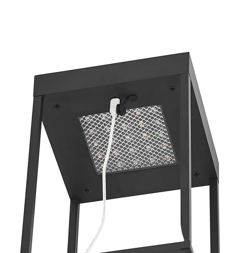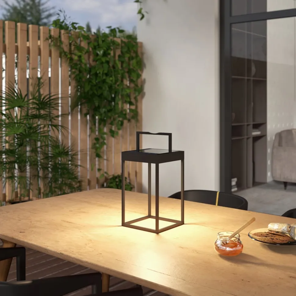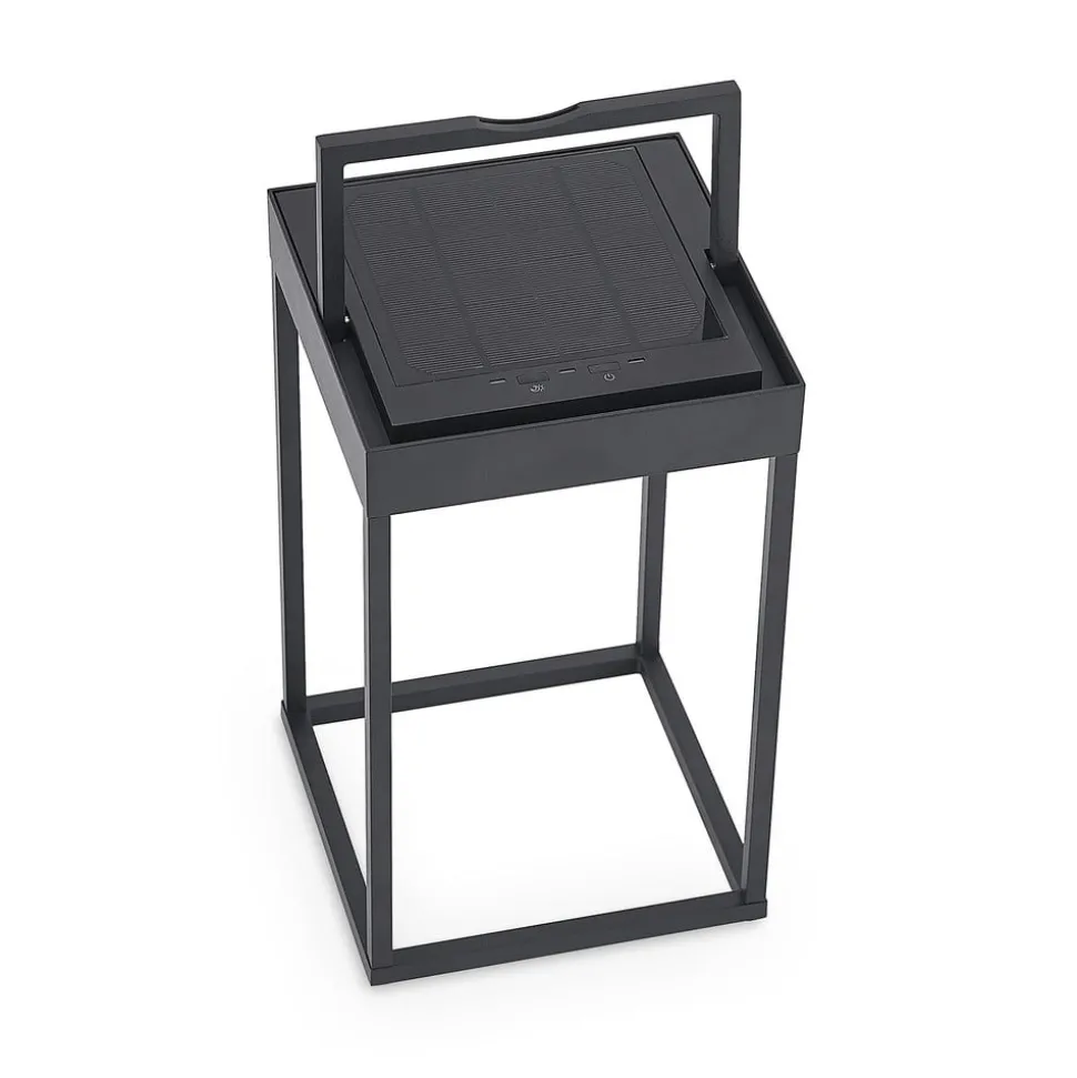 Lynzy LED lamp op zonne-energie in een eenvoudig ontwerp van zwart aluminium De Lynzy LED lamp op zonne-energie combineert een eenvoudig uiterlijk met praktische functies. Het bestaat uit een hoekig lichaam, dat in effen zwart is uitgevoerd en bestaat uit slanke stutten die een kubusvorm hebben. Binnenin dit element zitten permanent geïnstalleerde LED’s die het nodige licht genereren. Het eerder onopvallende ontwerp integreert moeiteloos in de architecturale stijl van een huis zonder deze te doorbreken en plaatst discrete accenten op vlakke muren. De lamp heeft ook een afneembare muurbeugel, waardoor hij als wandlamp maar ook als tafellamp kan worden gebruikt. De lamp kan worden opgeladen via het zonnepaneel of met een USB-kabel – CCT 2.700 K of 3.000 K – Traploos dimbaar 5% – 100% – Batterijlevensduur > 9 uur – USB-aansluiting – Beschermingsgraad IP65