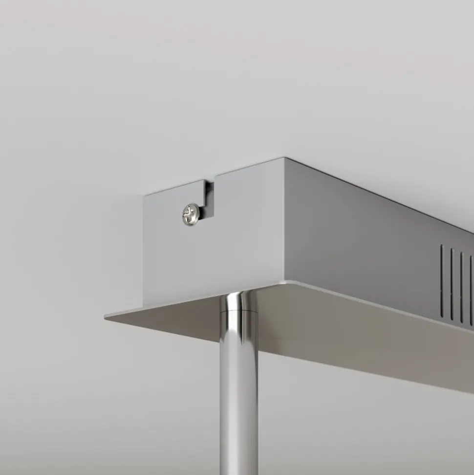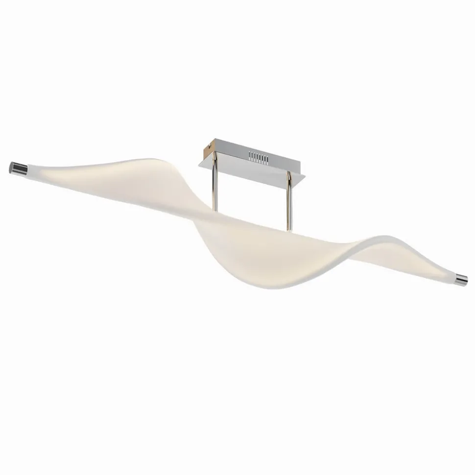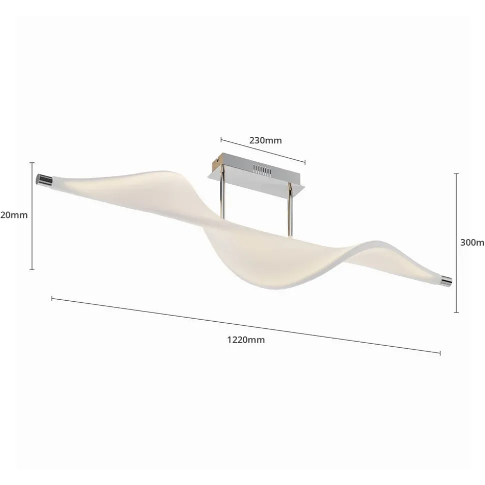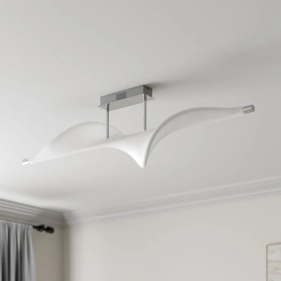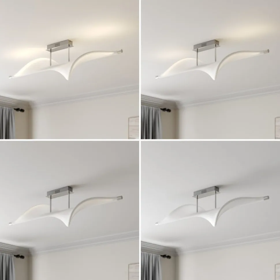 Edano LED plafondlamp met brede stoffen kap, traploze dimfunctie via schakelaar De Edano plafondlamp ziet eruit als een vogel die met wijd uitgespreide vleugels in de wind zeilt met zijn witte stoffen kap, die een gebogen vorm heeft en op een kleine afhanghoogte van de aluminium plafondhouder hangt. De moderne LED plafondlamp maakt indruk met haar ongewone ontwerp en grootte, waardoor ze ideaal is voor een grote woon- of slaapkamer. Ze straalt een warmwit licht uit dat met elke standaard lichtschakelaar in drie verschillende helderheidsniveaus kan worden geschakeld en dus kan worden gedimd zonder dat er een extra dimmer hoeft te worden geïnstalleerd. Het licht kan via de lichtschakelaar worden ingesteld op 100%, 40% en 10% helderheid, zodat op elk moment de juiste verlichting kan worden gekozen. 3-staps dimbaar + uit: het licht kan zoals gebruikelijk met een wandschakelaar worden in- en uitgeschakeld. Dankzij de 3-staps dimtechnologie met geïntegreerde uit-functie kan de lamp ook worden gedimd tot drie verschillende helderheidsniveaus door meerdere keren op de schakelaar te drukken: 100%, 40% en 10%.