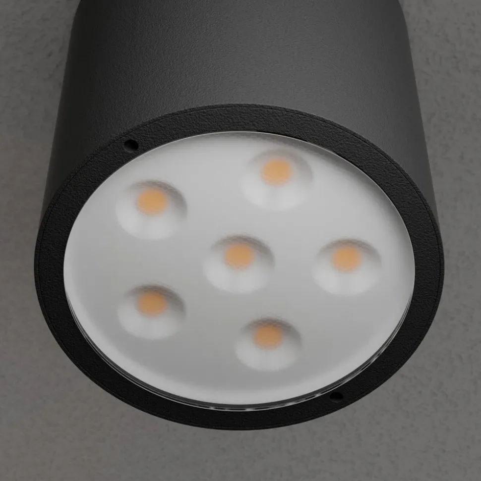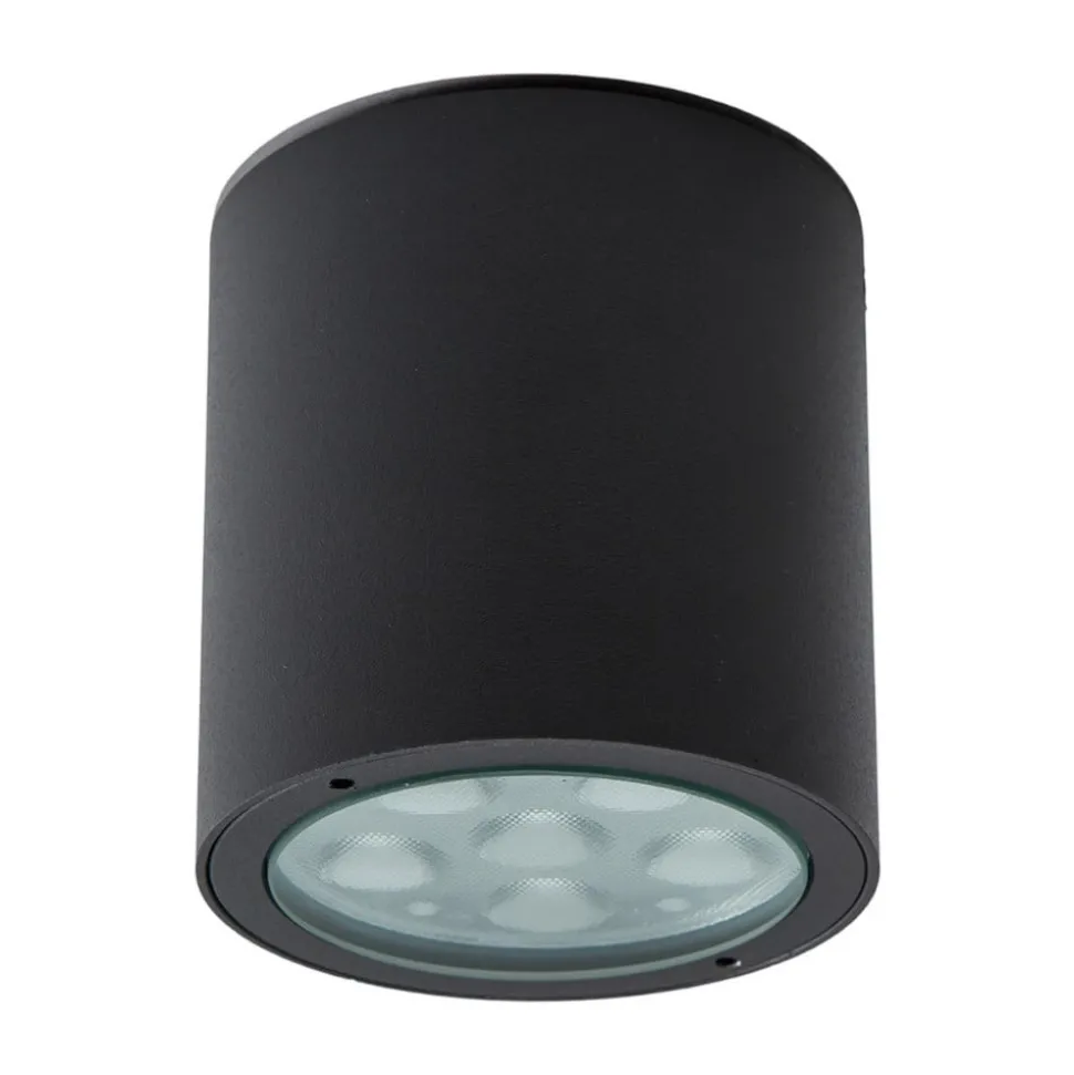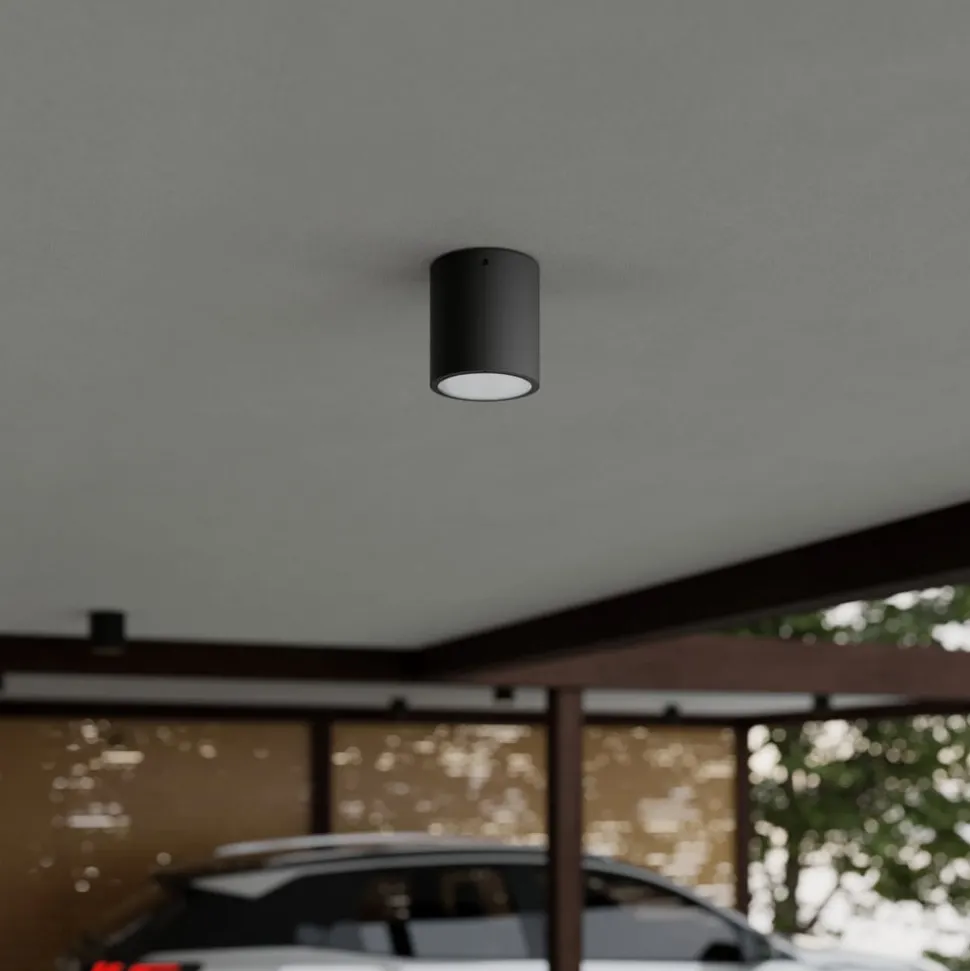 Grafietgrijze Meret LED plafondspot voor buiten, 432 lumen De cilindervormige Meret LED plafondspot heeft een modern maar onopvallend ontwerp. Aan de onderkant is een ronde opening te zien, die is voorzien van stevig gehard glas en zes LED lampen van het merk Cree bevat van elk 1 watt. De lichtstroom is 432 lumen, wat neerkomt op een energiebesparende 71 W per lumen. Dankzij de beschermingsgraad IP54 kan de LED plafondlamp zonder aarzeling buiten worden gebruikt, omdat ze voldoende beschermd is tegen het binnendringen van water en vuil. Meret is daarom desgewenst ook een uitstekende keuze voor badkamers of andere vochtige ruimtes, zoals kelders en gangen. De opbouwdownlight is ook ideaal voor gebruik in industriële ruimtes. De buitenkant van de ronde plafondlamp is gelakt in tijdloos, donker grafietgrijs.