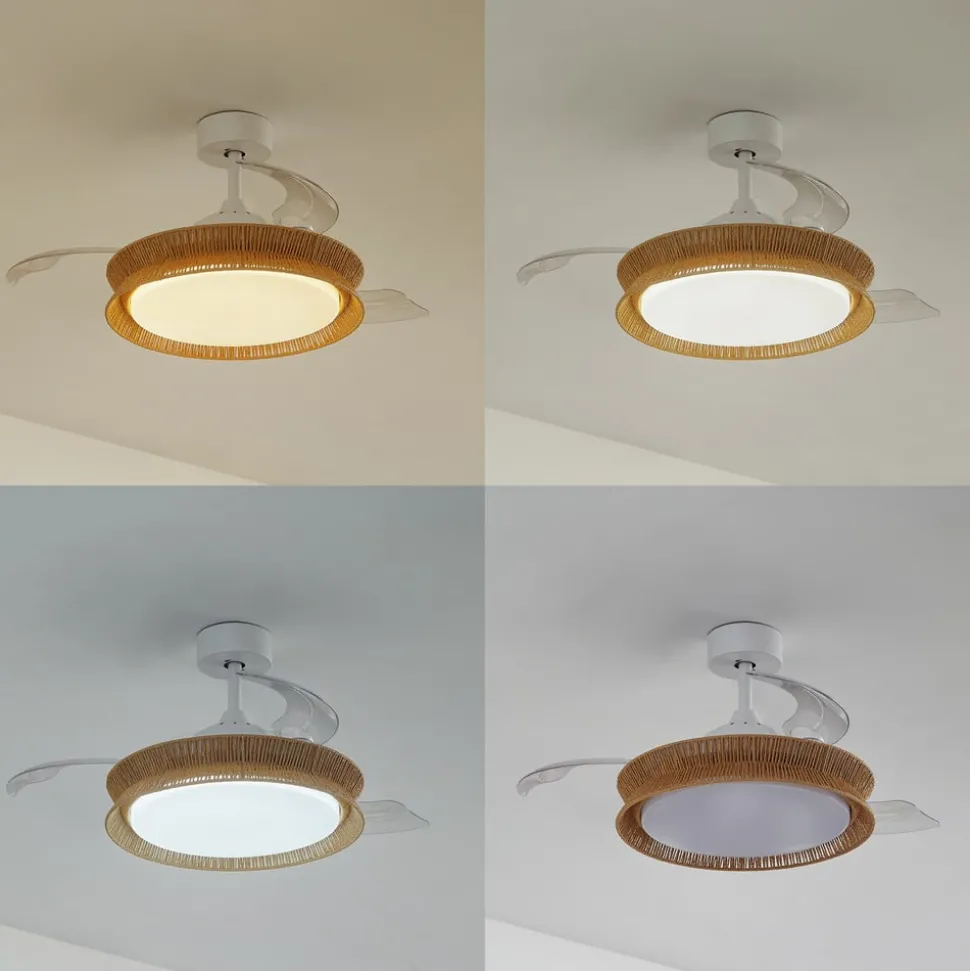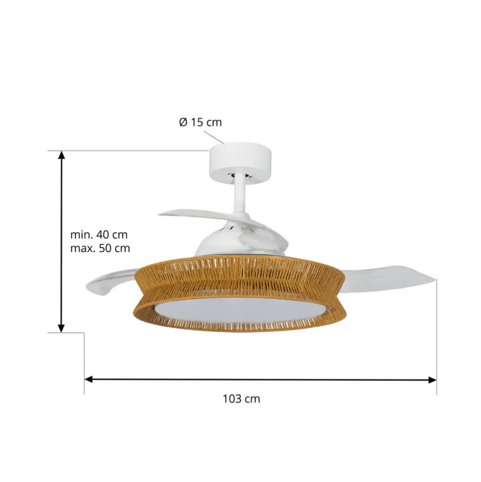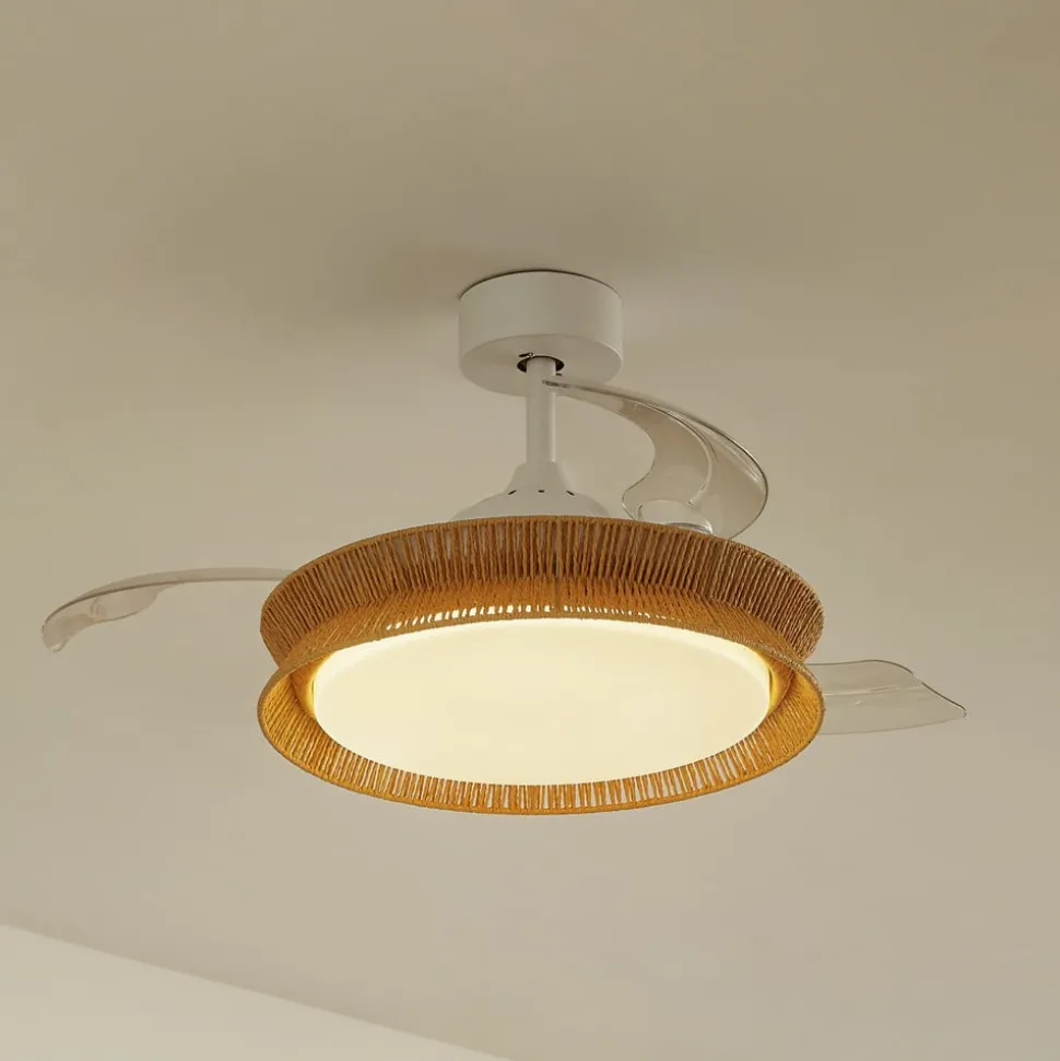 Opvallende LED plafondventilator Lineta met kap van natuurlijk touw – inclusief dimmer en CCT-functie
