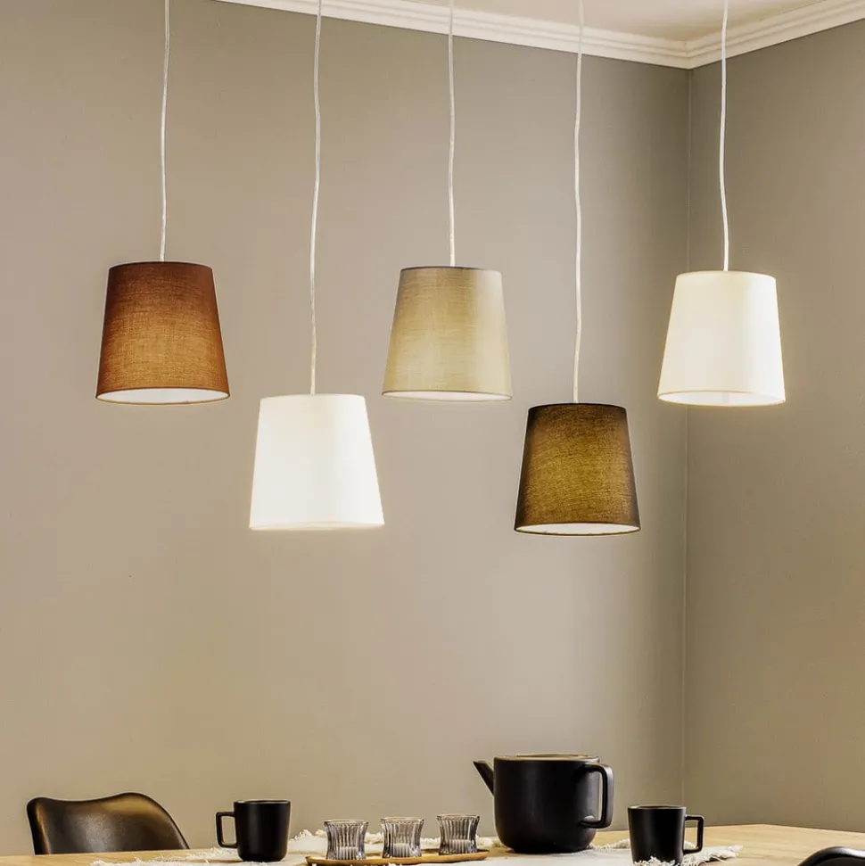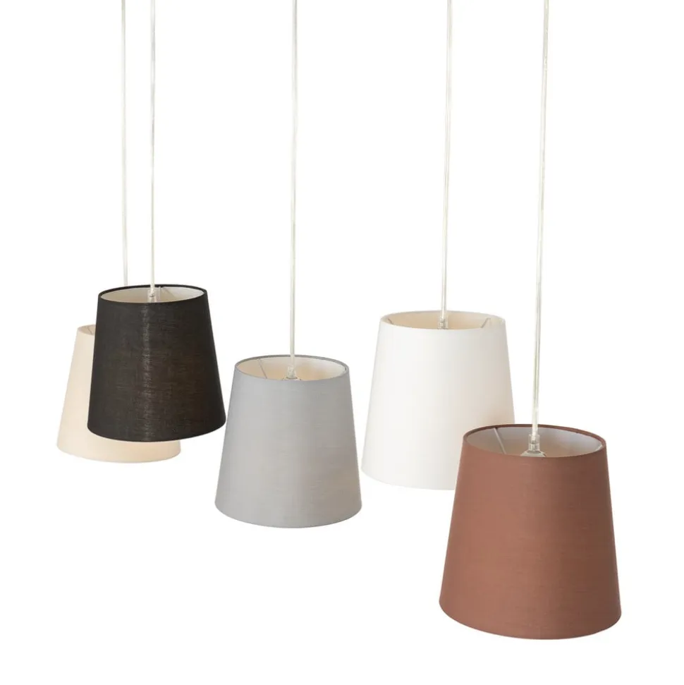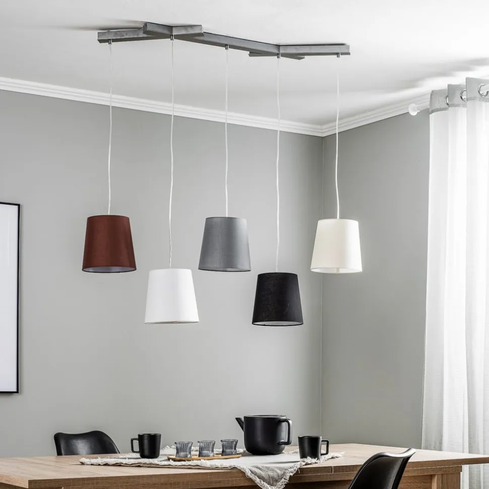 5-lamps Thamila hanglamp van stof met textielen kappen in verschillende kleuren Deze hanglamp, waarvan de plafondhouder bestaat uit gekruiste stijlen, combineert vijf kappen in verschillende kleuren, waardoor de uitstraling niet felgekleurd is, maar eerder aards, omdat de kappen in bruin-, grijs- en crèmetinten zijn en ook zwart en wit tot de kleuren van de kappen behoren. Het resultaat is niet alleen een decoratieve uitstraling, maar ook een bijzonder gezellig verlichtingseffect, omdat de stof het licht zachtjes dimt en een gezellige sfeer in de kamer creëert. Het licht slaat een mooi figuur boven de eetkamertafel en maakt van een maaltijd veel meer dan alleen een maaltijd. Het is niet langer alleen een plek waar gegeten wordt, maar een plek waar familie en vrienden samenkomen en waar mensen zich op hun gemak voelen en genieten van het gezelschap, het vrolijke gelach en de stimulerende gesprekken.