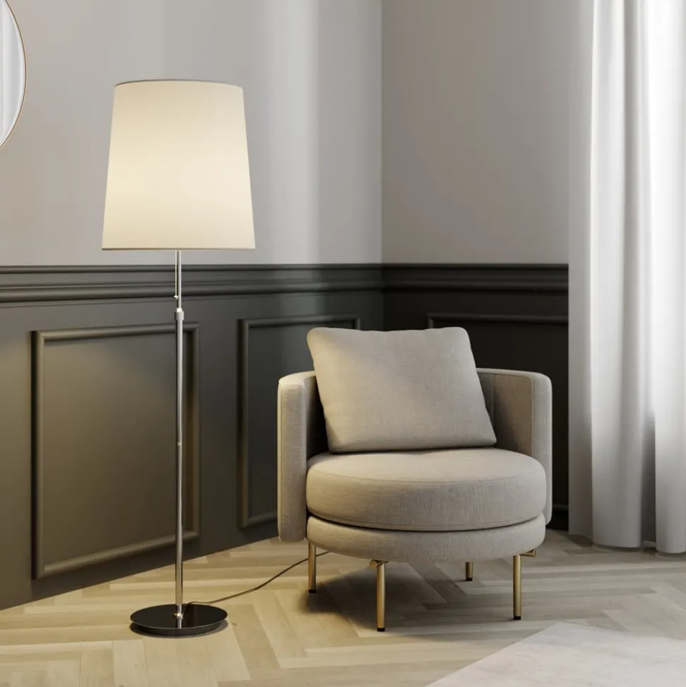 Vloerlamp van textiel Pordis met witte kap en verchroomd, in hoogte verstelbaar frame Deze vloerlamp presenteert zich in een modern jasje met een discrete uitstraling en is de ideale aanvulling voor woon- en slaapruimtes. De kap wordt naar boven toe iets smaller en heeft een wit oppervlak dat een mooie, gezellige gloed creëert. Het frame heeft een telescopisch element zodat de hoogte naar wens kan worden aangepast (129,5 cm – 155 cm). De voet van de lamp en het frame zijn ook afgewerkt in glanzend chroom, wat samen met de witte kap zorgt voor een harmonieuze look met een licht contrast.