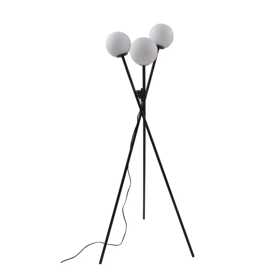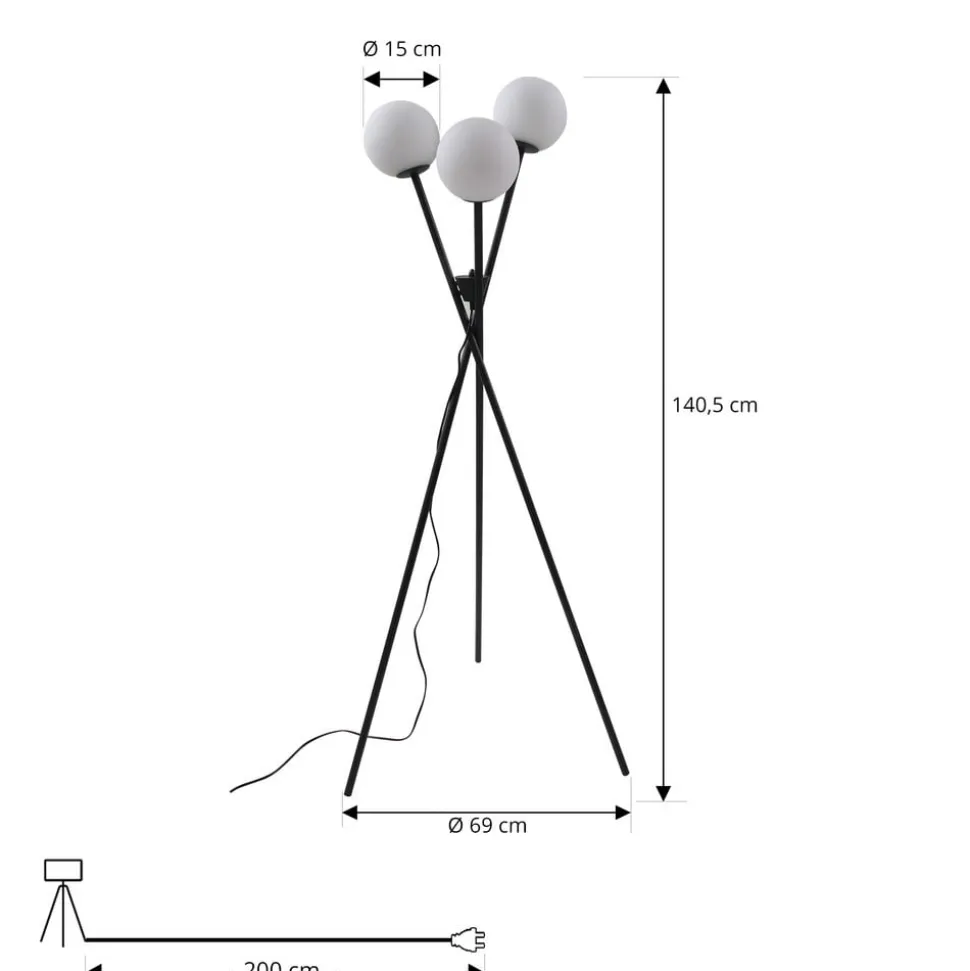 Vloerlamp Visata met drie witte glazen kappen De vloerlamp Visata van Lucande met drie kapjes is een modern hoogtepunt voor elke woonkamer. Met haar stijlvolle ontwerp van ronde, witte bollen en drie sierlijke, zwarte poten geeft ze elke kamer een inspirerende sfeer. Geïnspireerd door het ontwerp van een vloerlamp op drie poten, is hij bijzonder decoratief en spot hij zijn licht rondom. Dit wordt als niet-verblindend en aangenaam ervaren dankzij het dempende effect van het opalen glas.