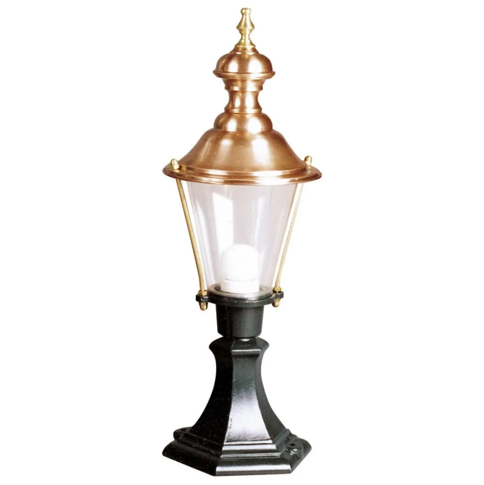 Luuk sokkellamp met elegant koperen dak en elegante voet Deze sokkellamp, een handgemaakt kwaliteitsproduct van massief gegoten aluminium, zorgt voor sfeervol licht buiten. Hij is geëmailleerd volgens de hoogste kwaliteitsnormen om hem te beschermen tegen de meest extreme weersomstandigheden. De Luuk sokkellamp maakt daarom niet alleen indruk met zijn elegante ontwerp in antieke stijl, maar is ook extreem weerbestendig. Installatievoorschrift: De lamp wordt rechtstreeks op de fitting aangesloten. We raden aan om de installatie te laten uitvoeren door een gekwalificeerde elektricien, omdat de fabrikant het gebruik van rubberen kabels aanbeveelt.