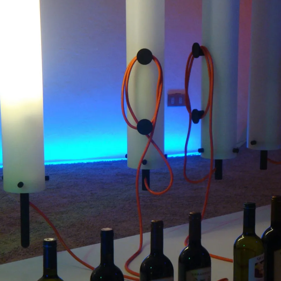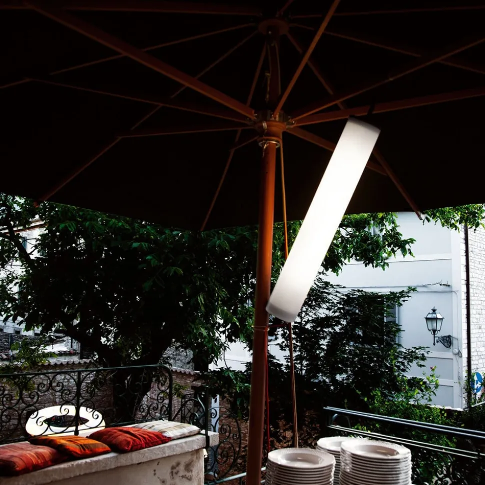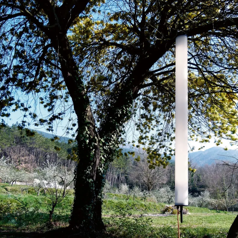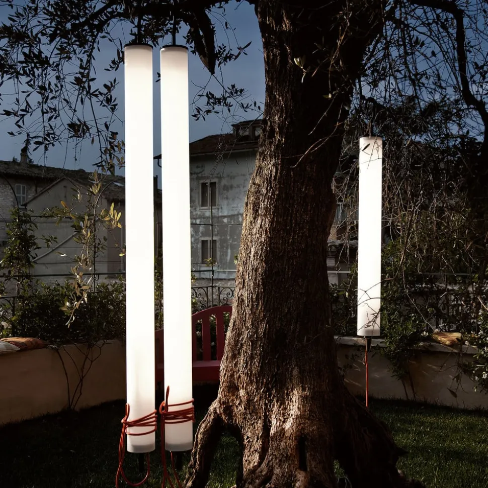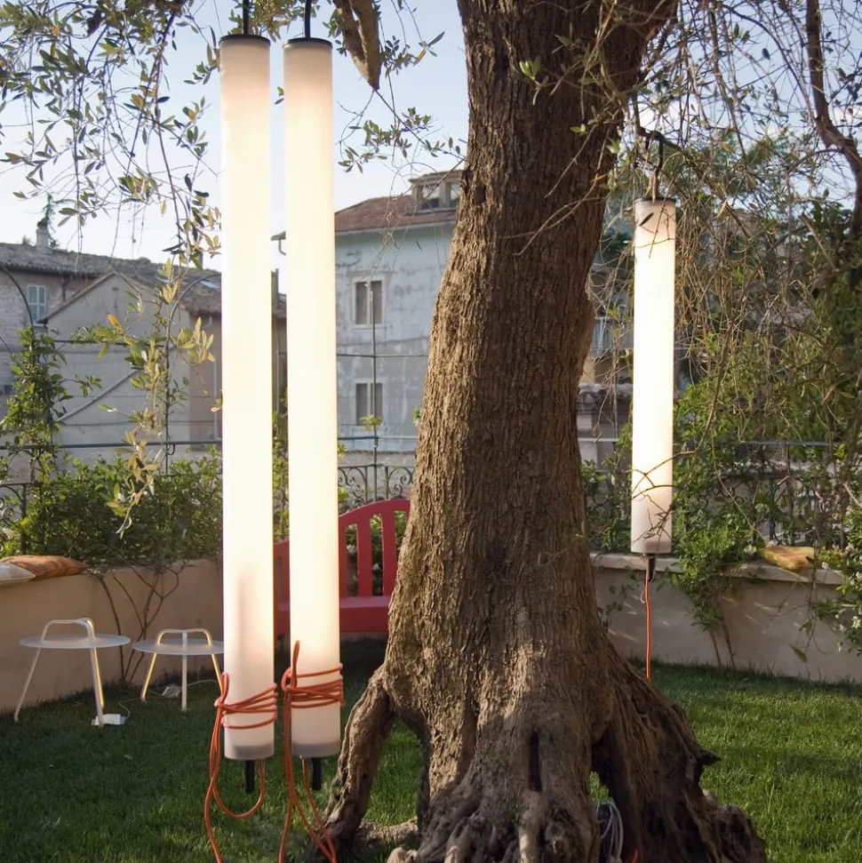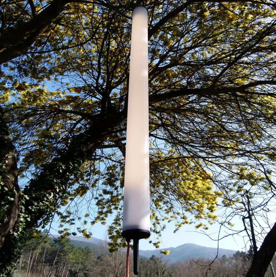 Geplaatst als solitair of in een groep, verrijkt Pistillo de tuin of het terras met zacht licht terwijl het een sterke visuele aanwezigheid behoudt. De armatuur is vormgegeven als een cilindervormige buis van opaal methacrylaat en voorzien van zwarte eindkappen en haken van zwarte kunsthars. Deze laatste, evenals de oranje kabels, maken een flexibele bevestiging aan planten, balken, enz. in elke richting mogelijk.