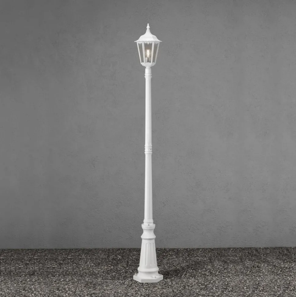 Antiek aandoende buitenlantaarn FIRENZE van aluminium met fraai vormgegeven lantaarn op een mooi versierde paal. De lamp zorgt voor een zeer goede verlichting dankzij het heldere glas. De buitenlantaarn is leverbaar in wit, groen of zwart mat gelakt en wordt inclusief paal geleverd.