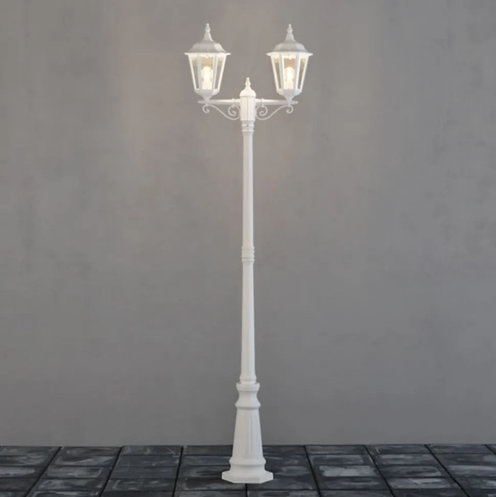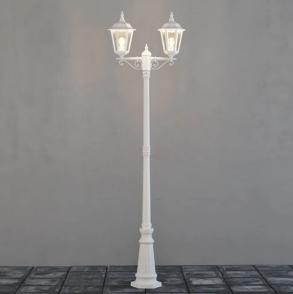 Deze antiek aandoende buitenlantaarn FIRENZE van aluminium met 2 fraai vormgegeven lantaarns op de mooi versierde paal, zorgt in elke buitenzone voor een sfeervolle verlichting. De lampen zorgen dankzij het heldere glas voor een zeer goede verlichting. De buitenlantaarn is leverbaar in wit, groen of zwart mat gelakt en wordt inclusief paal geleverd.
