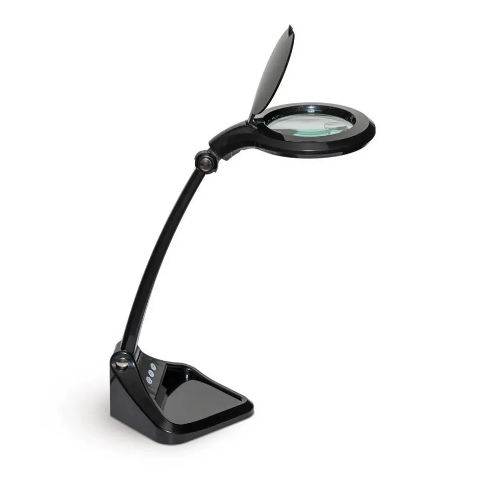 Dimbare MAULiris LED loeplamp met extra ingebouwde lens van echt glas Of het nu gaat om het in elkaar zetten van kleine onderdelen in een werkplaats of het sorteren van postzegels – de MAULiris LED loeplamp is de perfecte keuze. Hij is uitgerust met een 3-dioptrische lens (1,75x vergroting, Ø 10 cm) en een extra 12-dioptrische lens van echt glas (4x vergroting, Ø 2,5 cm). Die heeft een lensoppervlak van 78,5 vierkante centimeter. Das en de arm kunnen worden gekanteld zodat het licht tijdens het werk altijd kan worden aangepast. Die lichtuitstraling is zeer homogeen dankzij de ringvormige LED’s. De voet is zeer stabiel dankzij het geïntegreerde verzwaringselement en een bureauvriendelijke voet voorkomt krassen op het bureaublad. Das licht kan aan/uit worden geschakeld en traploos worden gedimd met de schakelaar in de voet – met diffuser voor minimale schaduw – de lampkop kan driedimensionaal worden versteld – met rek in de voet voor klein keukengerei
