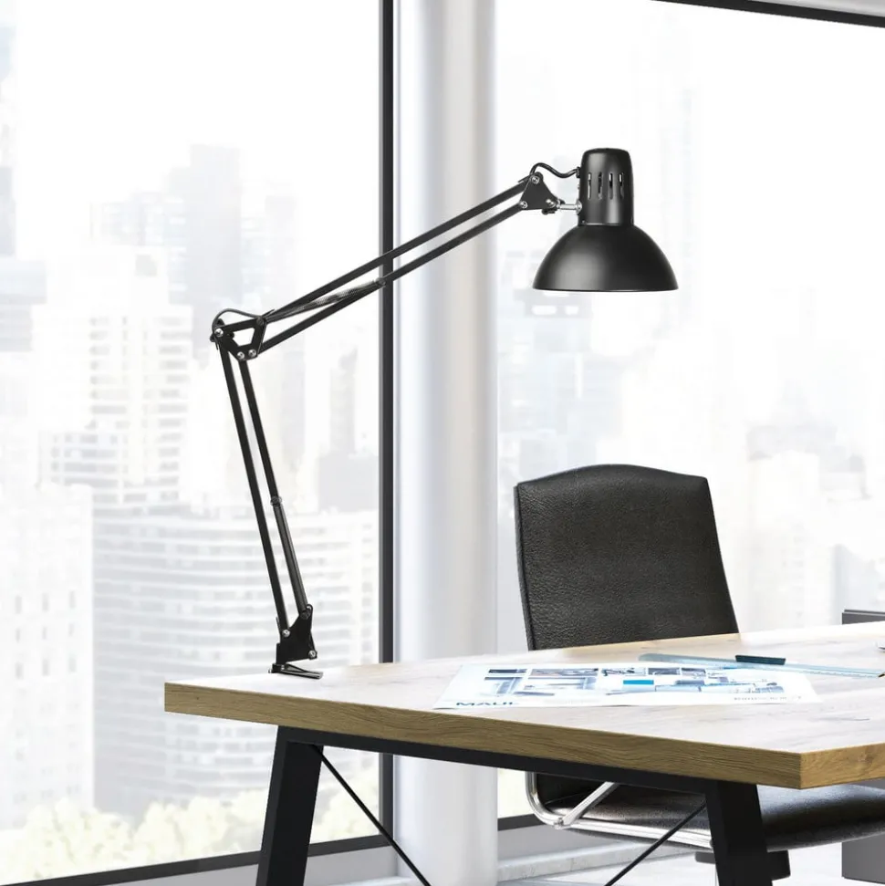 Klassieke MAULstudy bureaulamp met E27 De MAULstudy bureaulamp is de absolute klassieker onder de bureaulampen. De kap en armen zijn gemaakt van metaal en kunnen in alle richtingen worden versteld. De twee armen zijn elk 35 cm lang, de kap heeft een diameter van 17 cm en een reflectorlamp aan de binnenkant voor optimaal lichtgebruik. Study is uitgerust met een warmwitte LED lamp E27 en biedt hoge prestaties bij een laag energieverbruik. De aan/uit-schakelaar bevindt zich op het snoer en de Study bureaulamp wordt bevestigd met een klemvoet (klembreedte 0 – 5,5 cm) – 1840 lux verlichtingssterkte op een afstand van 35 cm
