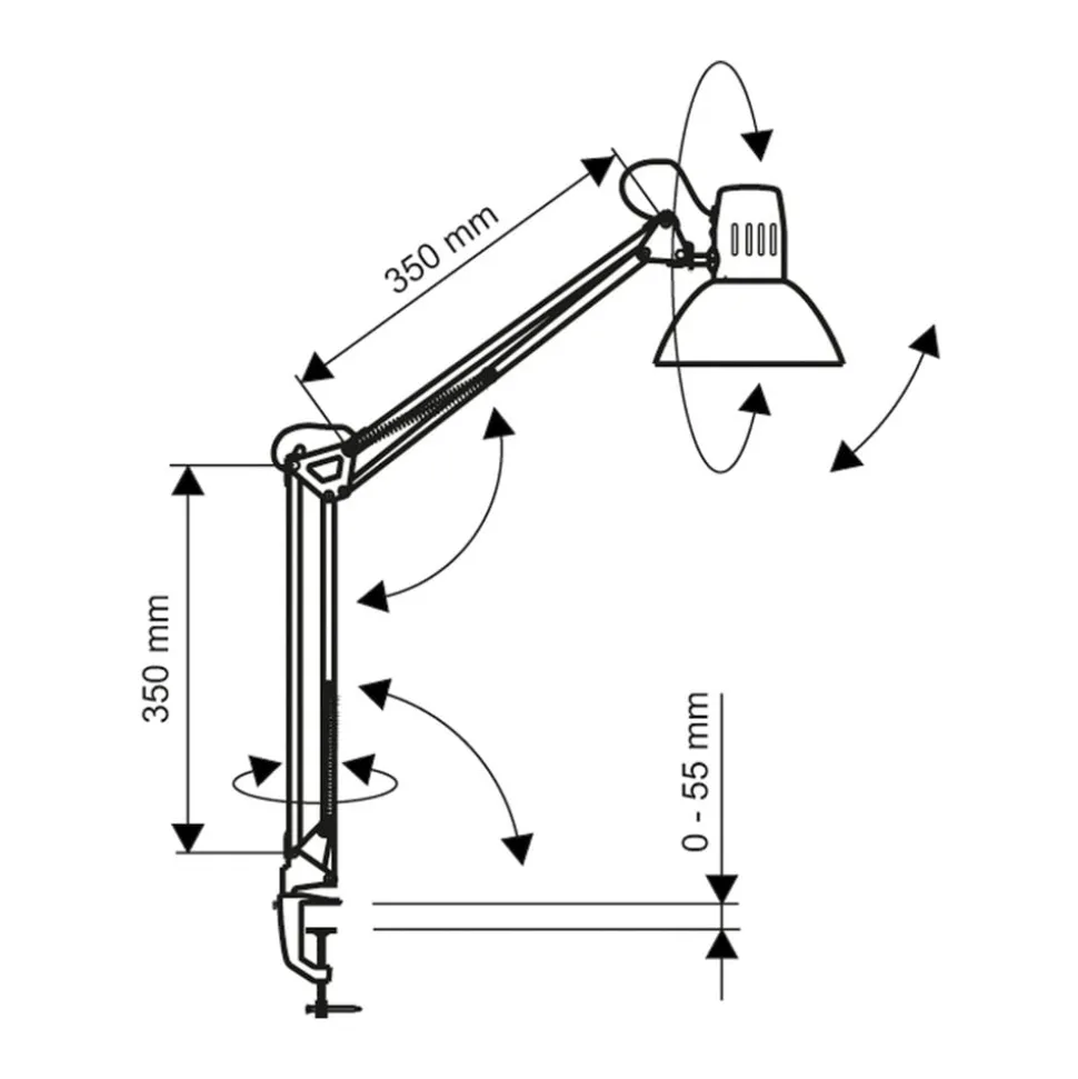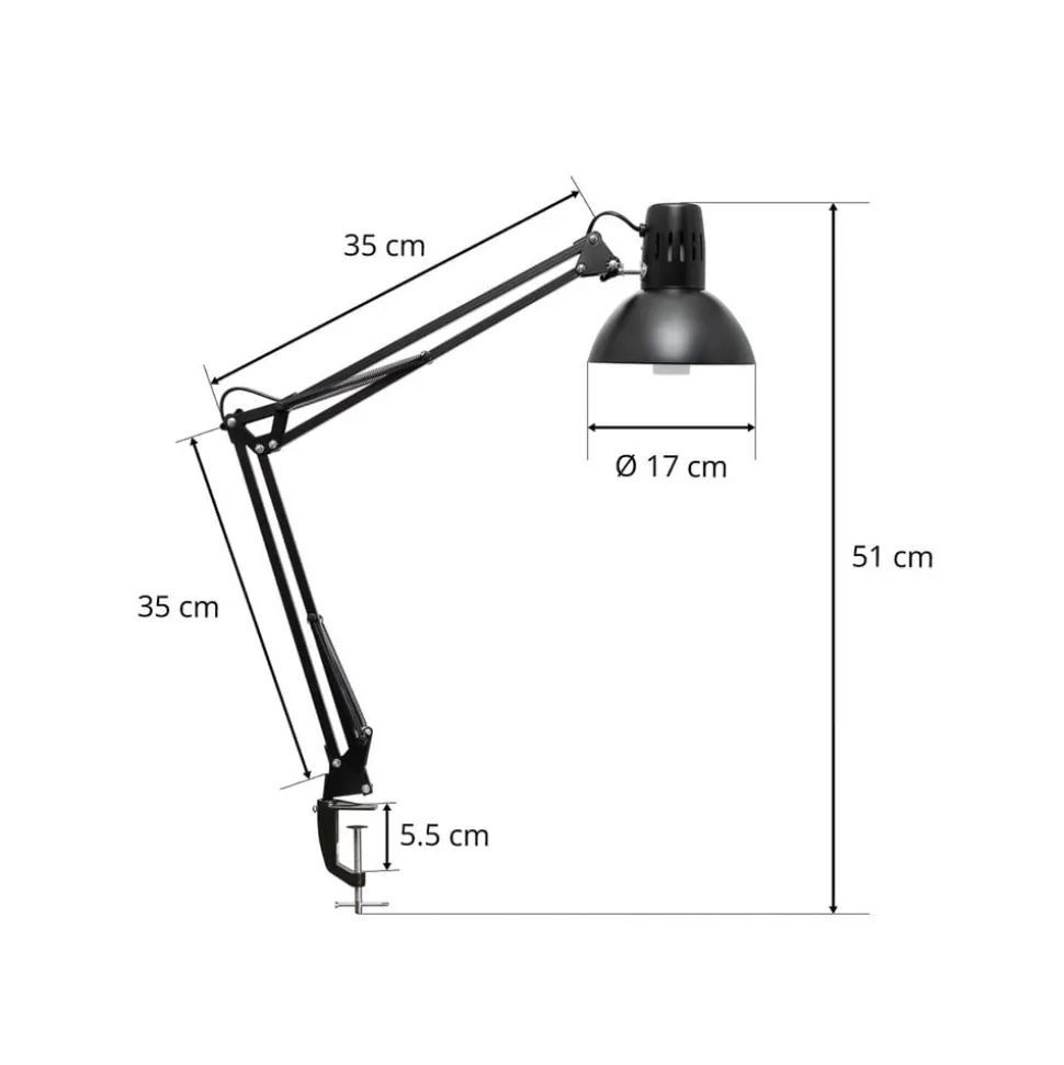 - Armlengte onder en boven elk 35 cm, lampenkop – Ø 17 cm, klembreedte tot 5,5 cm