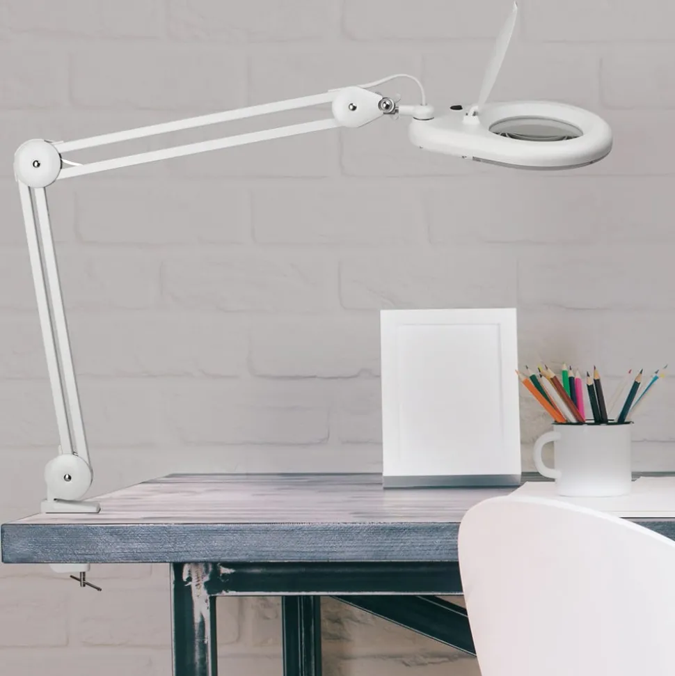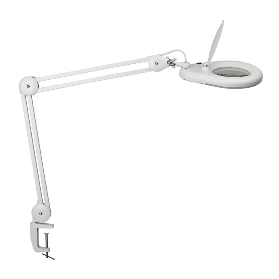 Praktische MAULviso LED loeplamp met klem De MAULviso LED klemlamp met ringvormige opstelling van LED’s zorgt voor een continue en schaduwvrije verlichting. Dankzij de draai- en kantelbare metalen arm en de lampenkop is een variabele uitlijning gegarandeerd. Het armatuur kan dus worden aangepast aan de gewenste eisen. Het ingebouwde vergrootglas met zijn 3-dioptrie lens van echt glas en 1,75x vergroting voldoet niet alleen aan zijn doel voor privégebruik, maar is ook populair in commerciële faciliteiten. De beschermkap beschermt de loeplamp tegen vuil en is daardoor ideaal voor gebruik in de werkplaats.