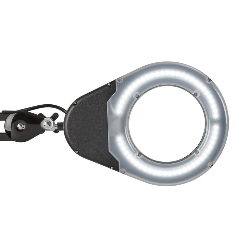 Verstelbare LED loeplamp MAULviso in zwart MAULviso is een stabiele en stevige, zeer verstelbare loeplamp uitgerust met een sterke parallellogramvormige metalen arm en een stabiele voet met draaischarnier. Ideaal voor nauwkeurig werk in laboratoria, werkplaatsen, dokterspraktijken of voor mechanisch precisiewerk in huis. De geïntegreerde 3-dioptrische lens van echt glas vergroot 1,75x, de 90 LED’s in de ringvormige lampenkop geven licht in de lichte kleur daglicht, waardoor het werkgebied zonder schaduwen wordt verlicht.