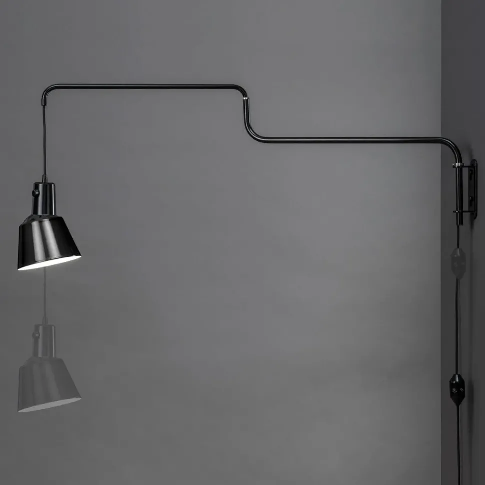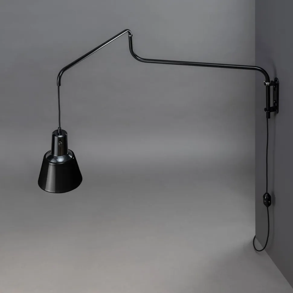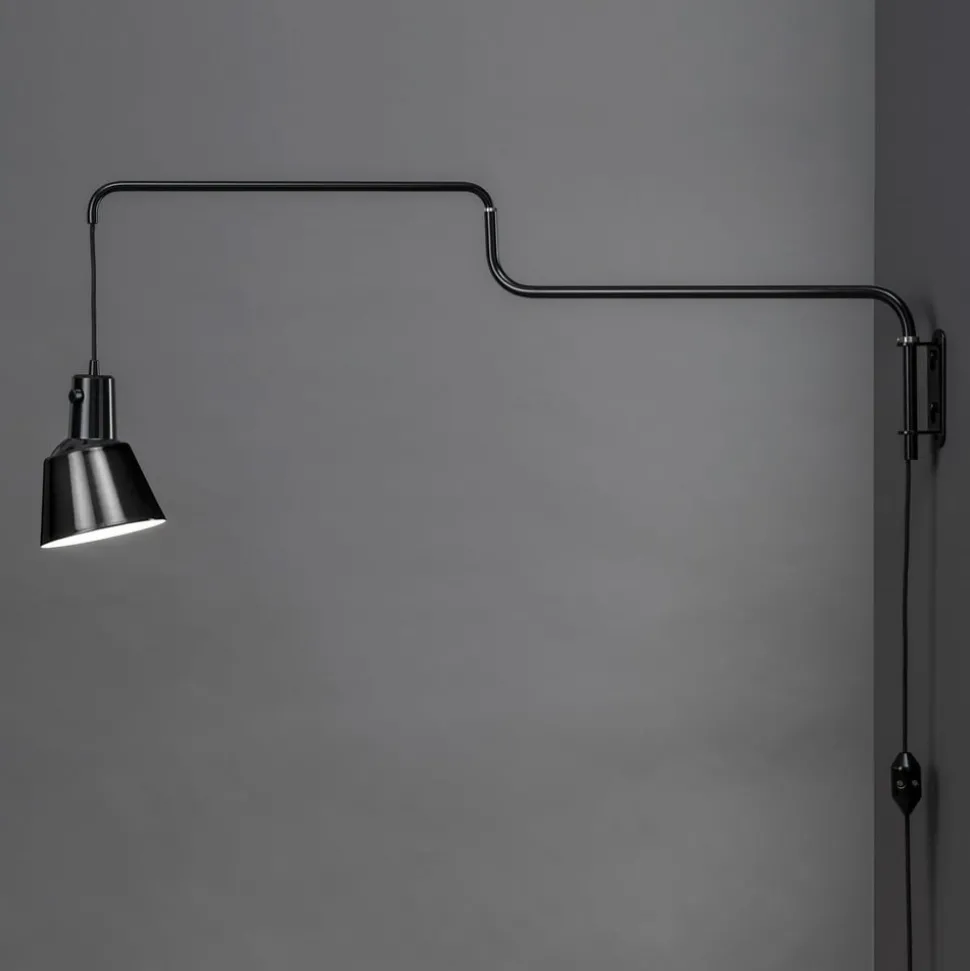 Extreem flexibel: wandlamp K830 van staal met geëmailleerde kap, Made in GermanyHet oorspronkelijke ontwerp van de veelzijdige wandlamp K830 stamt uit de jaren 1930. Het werd ontwikkeld door de Duitse industrieel ontwerper Werner Glasenapp. Nu wordt K830 tot leven gebracht door midgard, een fabrikant van armaturen die in 1919 werd opgericht en nog steeds uitsluitend in Duitsland produceert. De basis is gemaakt van zwart gelakte stalen buizen die worden ondersteund door een eveneens stalen en zwart afgewerkte muurbeugel. Beide armen zijn flexibel zwenkbaar voor een optimale uitlijning van het licht. Bovendien kan de ophanging van het rolgordijn worden gevarieerd, zodat het tot 109 cm kan worden opgehangen. Daartoe wordt aan de textielkabel onder de wandsteun een contragewicht bevestigd. Deze is voorzien van een stekker, zodat dit armatuur gemakkelijk via een stopcontact van stroom kan worden voorzien. Bovendien kan de kap zelf, die van email is gemaakt, 360 graden worden gedraaid. Zo verlicht de K380 het gewenste gebied feilloos. Omdat deze innovatieve wandlamp zonder gloeilamp wordt geleverd, kan de lichtstemming naar wens worden beïnvloed door de keuze van de te gebruiken E27 lamp (zie accessoires). De witte binnenkant van de kap reflecteert het licht en zorgt zo voor een goede verlichting. Deze multifunctionele wandlamp wordt in- en uitgeschakeld met een draaischakelaar op de kap.