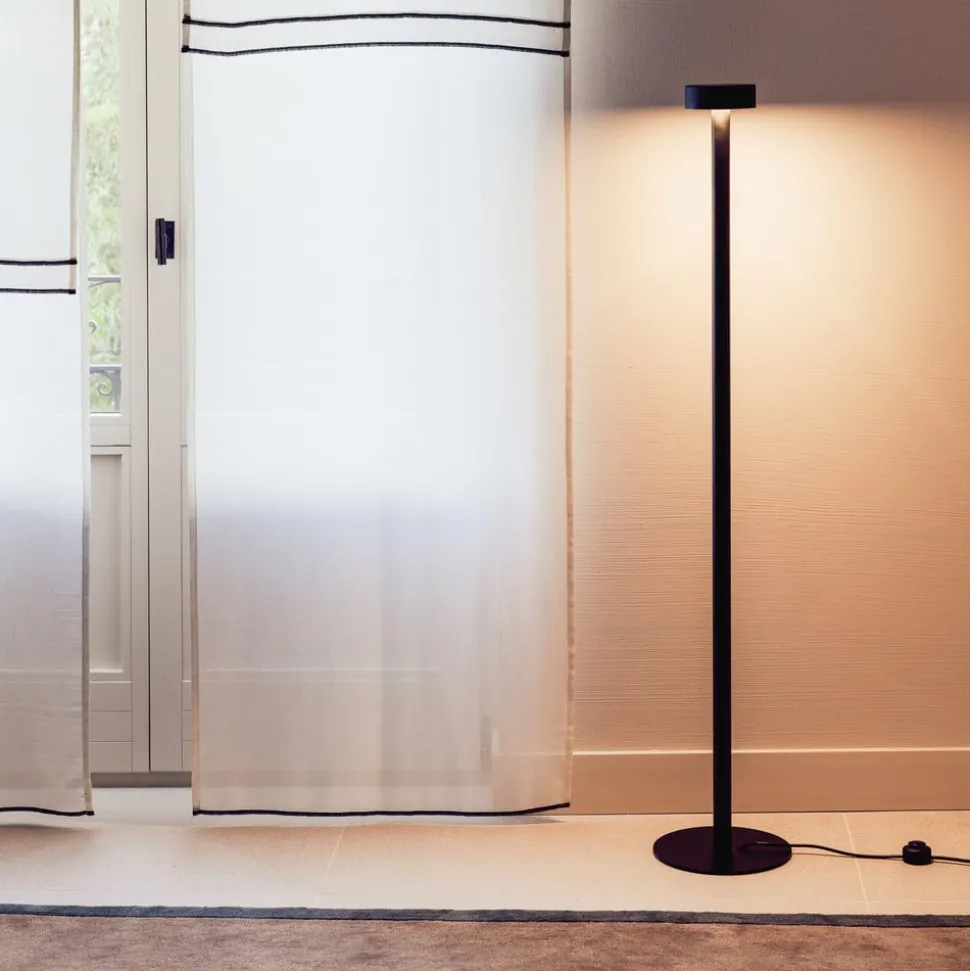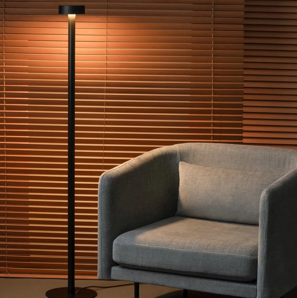 Het ontwerp van de vloerlamp Peak Lane onthoudt zich opzettelijk van pompeuze versieringen en wilde kleuren. Francesc Rifé experimenteert hier met rechte lijnen en cilindrische vormen, alles in zwart, zonder dat de armatuur met haar bestaan het hele interieur overneemt. Het minimalistische uiterlijk vestigt eerder de aandacht op de lichtbron zelf. De in de kap verborgen LED straalt zijn warm witte licht naar beneden uit en verlicht zo ook een deel van de staande buis van de vloerlamp, wat een mooi effect geeft. De lamp wordt in- en uitgeschakeld via de voetpedaalschakelaar die aan de voedingskabel is bevestigd. Indien gewenst kan deze ook worden vervangen door een schakelaar met geïntegreerde dimfunctie (zie accessoires).
