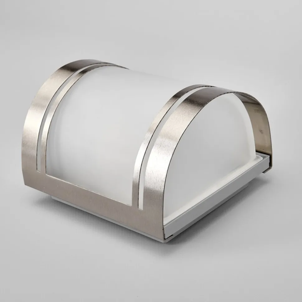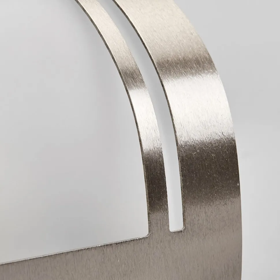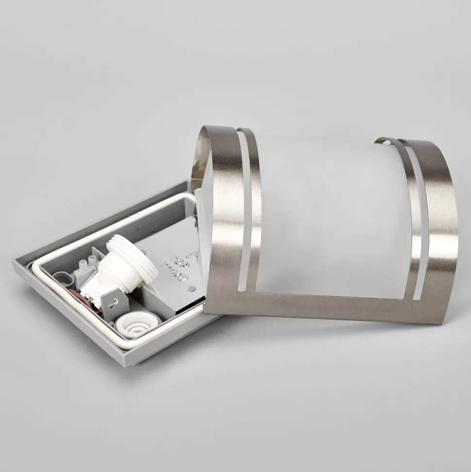 Het roestvrij stalen kader van deze moderne, halfronde buitenwandlamp is doortrokken met smalle stroken. Op die manier krijgt de look een individuele toets. Als afdekking voor de lichtbron doet een gesatineerde diffusor van polycarbonaat dienst die voor een aangenaam en gelijkmatig lichteffect zorgt.