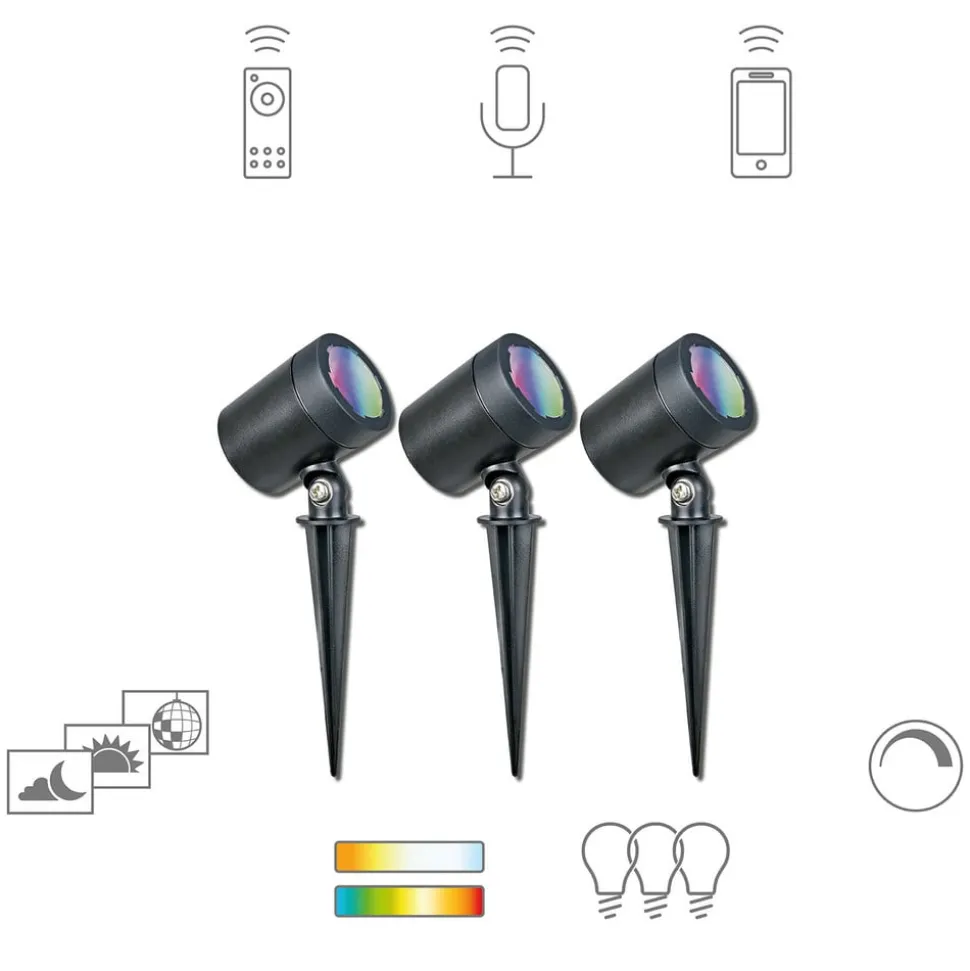 Flores LED buitenspot met grondspies in een praktische set van 3 – kan worden bediend met afstandsbediening, app of spraakassistent De moderne Flores LED buitenspot is uitgerust met een grondspies voor eenvoudige installatie. Dit betekent dat hij gemakkelijk overal in de tuin en buiten kan worden geïnstalleerd. De spots zijn uitgerust met een tintregelmodule en bieden met hun geïntegreerde LED’s kleurrijk en wit licht in verschillende temperatuurbereiken. Of het nu warm wit of daglicht is, de juiste lichtstemming kan op elk moment en voor elke gelegenheid worden gekozen. De instellingen worden gemaakt met een geschikte afstandsbediening of via de verbinding met een ZigBee SMART+ smart home systeem met een compatibele app. Spraakbesturing met de spraakassistent Alexa is ook mogelijk. Bovendien kan elke lamp afzonderlijk worden bediend zodat individuele kleuraccenten kunnen worden ingesteld. De set van 3 kan worden uitgebreid tot maximaal 5 lampen, waardoor de moderne en slimme Flores LED buitenspot kleur in de tuin kan brengen. Of het nu gaat om het verlichten van geselecteerde zones of gewoon om verlichting, de praktische set van 3 lampen kan op verschillende manieren gebruikt worden. Dankzij de hoge beschermingsgraad zijn de spots stofdicht en beschermd tegen waterstralen, zodat ze overal zonder aarzeling gebruikt kunnen worden. Functies/compatibiliteit: – bedienbaar via een geschikte tint afstandsbediening (zie accessoires) – bedienbaar via app op basis van ZigBee radiostandaard 3.0 – compatibel met de spraakassistent Alexa (Amazon) – kan worden geïntegreerd in ZigBee-gebaseerde smart home-systemen, bijvoorbeeld met Philips Hue, Osram Lightify etc. – verschillende wittinten (1800-6500 K) en tot 16 miljoen kleuren kunnen worden ingesteld – dimbaar in alle geselecteerde lichtkleuren – kan worden uitgebreid tot maximaal 5 tuinspots (uitbreiding afzonderlijk verkrijgbaar) – elke lamp kan afzonderlijk worden bediend – beschermingsgraad IP44 (spatwaterdicht)