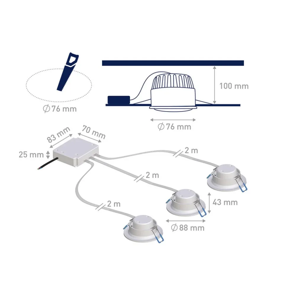 De Spotlight LED-inbouwset biedt drie downlights met een grote verscheidenheid aan licht. De inbouwarmaturen kunnen worden bediend met een afstandsbediening (zie accessoires) of met gangbare Smart Home-systemen via ZigBee 3.0. De lichtkleur kan worden ingesteld in volledig wit en andere kleurtinten; bovendien kan het licht onafhankelijk van de kleur traploos worden gedimd.