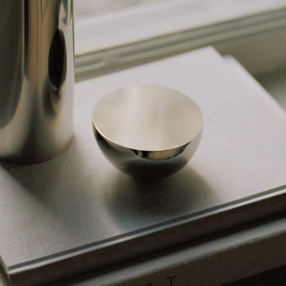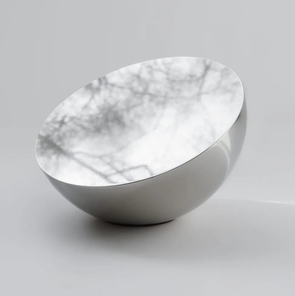Designtafelspiegel Aura van roestvrij staal De gedurfde materialiteit van de Aura-tafelspiegel creëert zijn unieke innerlijke gloed – zonder verlichting. Gemaakt van gepolijst roestvrij staal en ontworpen als een halve bol, vangt hij het omgevingslicht en creëert hij een verscheidenheid aan reflecties door de combinatie van harde, platte oppervlakken en lange rondingen. Zijn gewicht en sterkte worden in evenwicht gehouden door zijn zachte glans en sculpturale gebogen vorm. Productinformatie: Gemaakt van gepolijst roestvrij staal. Zorgvuldig handgemaakt – elke spiegel is uniek. Variaties in de aard van het materiaal en het oppervlak en kleine vlekken zijn mogelijk. Onderhoudsinstructies: Veeg het product af met een zachte, droge of vochtige doek. Gebruik geen schuurmiddelen of agressieve schoonmaakmiddelen zoals glasreinigers, terpentine of terpentijn.