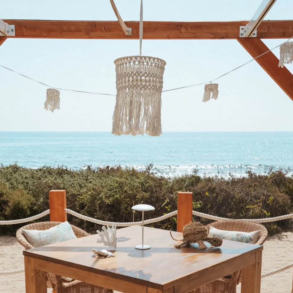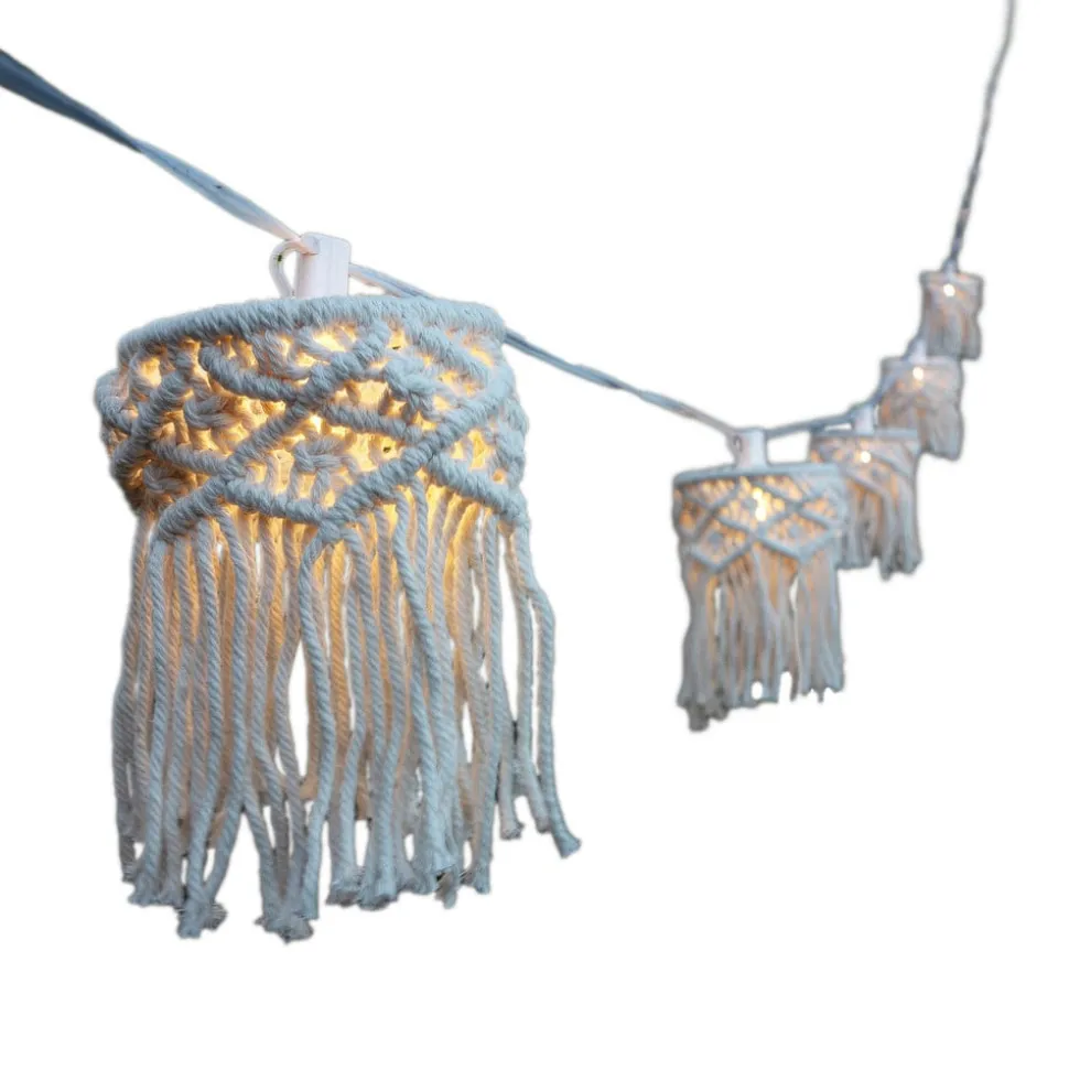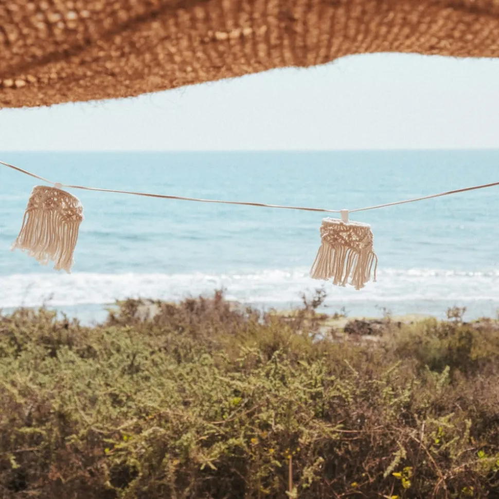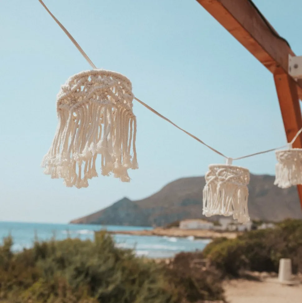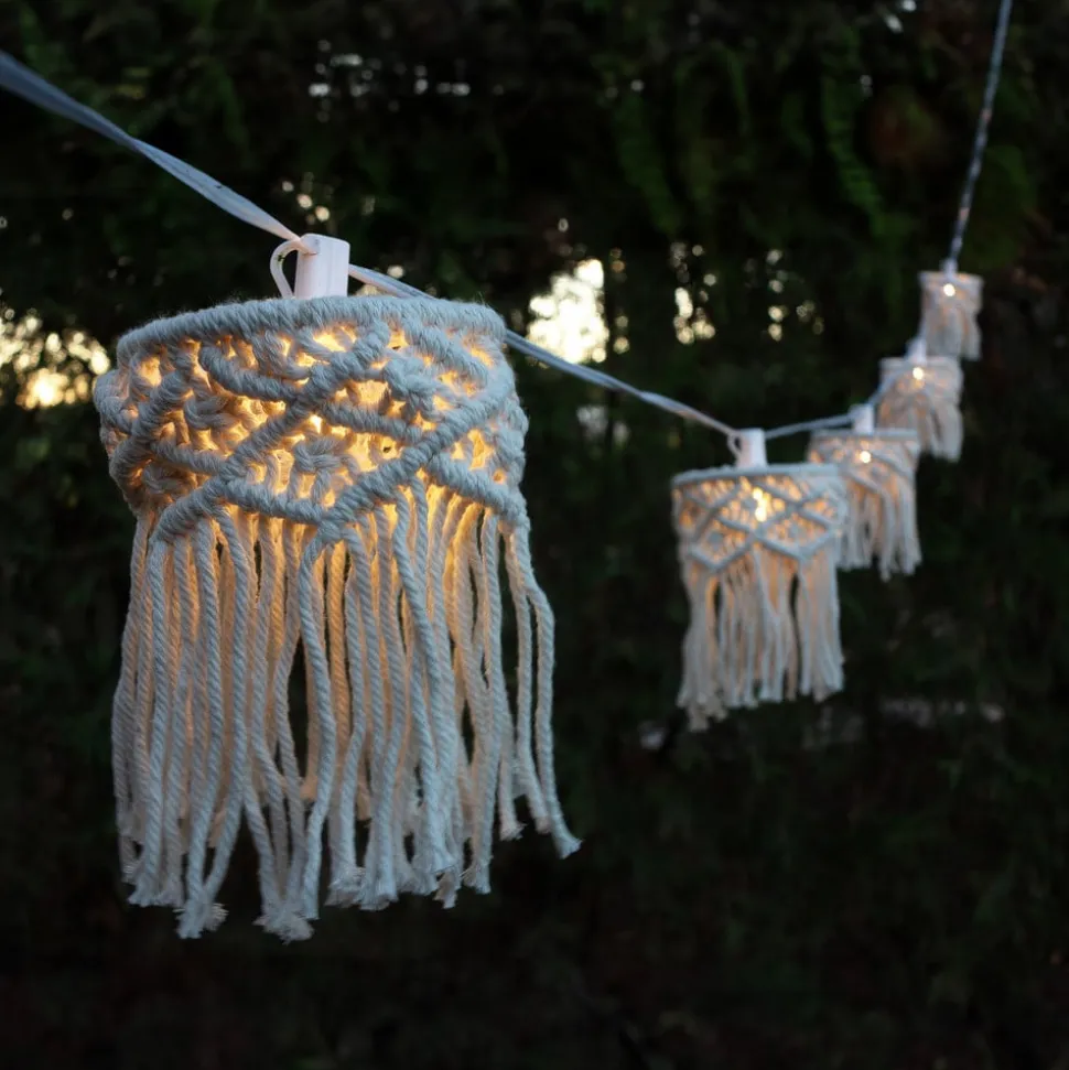 8-lamps Mykonos lichtkettingen met zonnepaneel en om op te laden De decoratieve, zomerse Mykonos lichtkettingen met kappen van gehaakt katoen kunnen worden opgeladen met zonne-energie of via een stopcontact (USB-C kabel inbegrepen, netadapter uitgesloten). De LED lampen zijn inbegrepen, maar kunnen worden vervangen.