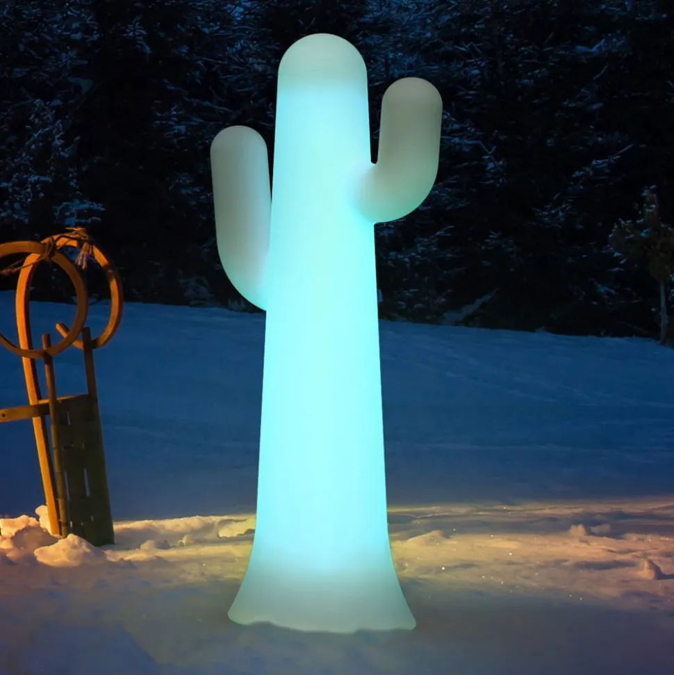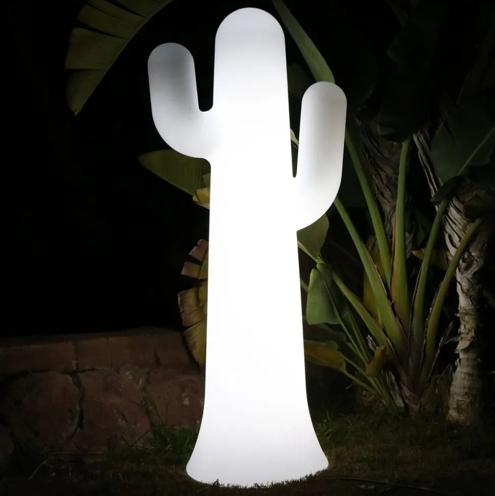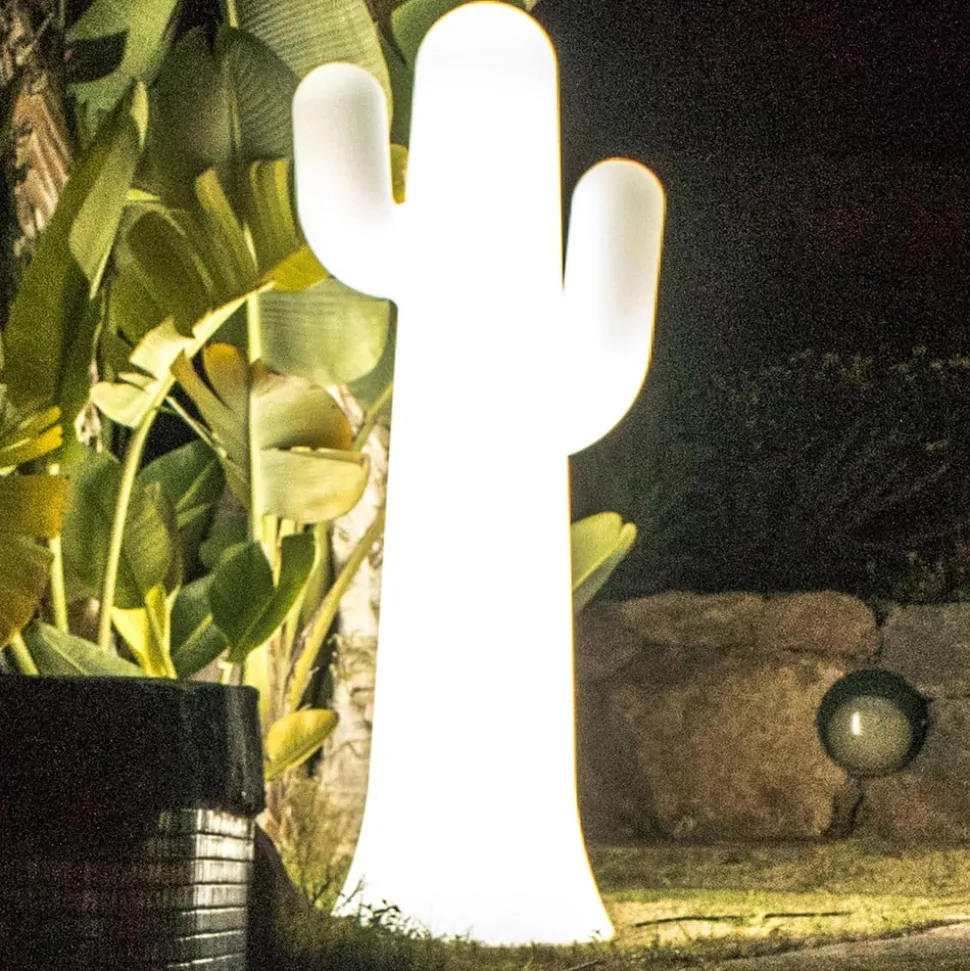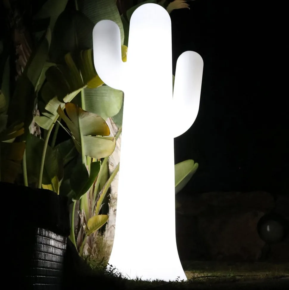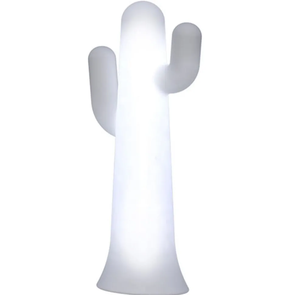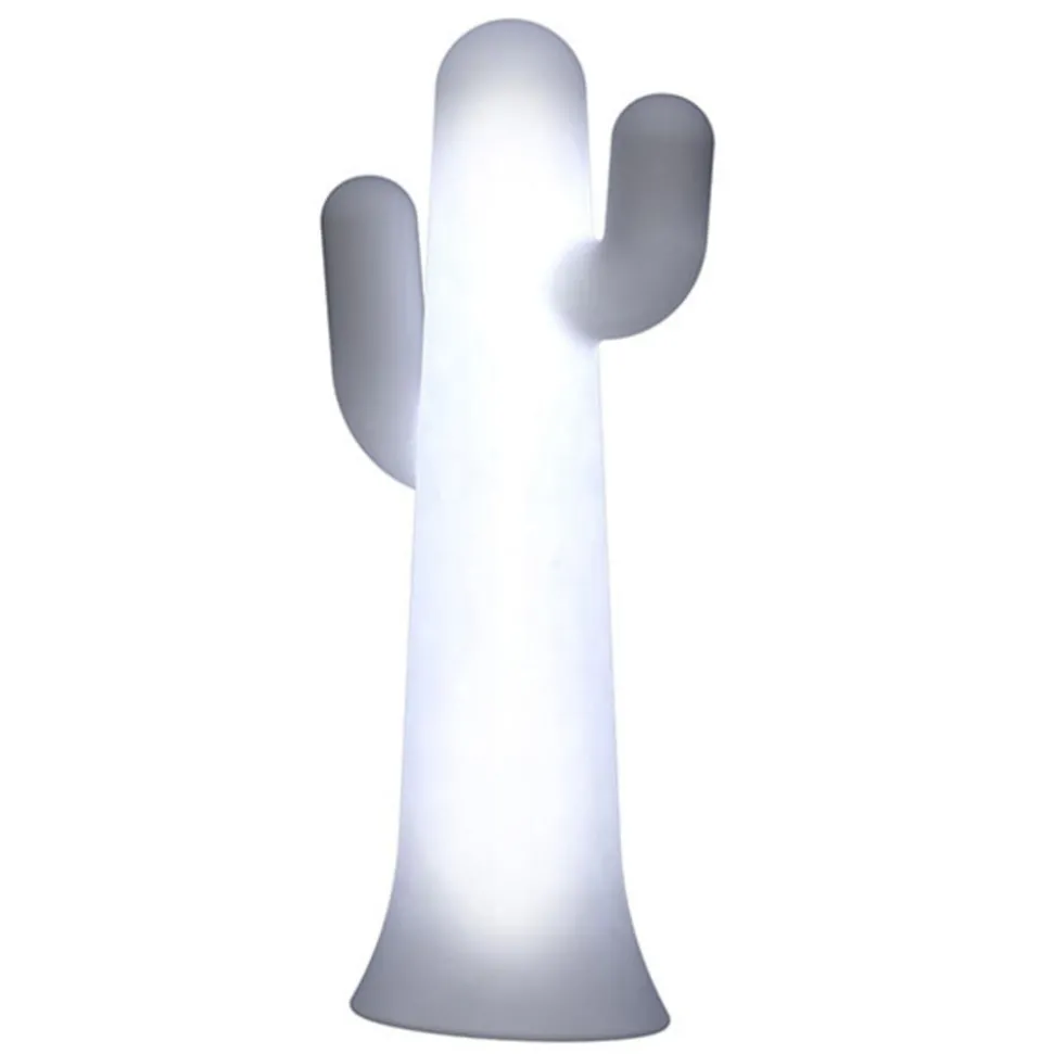 Witte vloerlamp Pancho in cactusvorm met oplaadbare batterij De vloerlamp Pancho, die de vorm heeft van een Mexicaanse cactus en gemaakt is van UV- en weerbestendig polyethyleen, kan worden verlicht met gekleurd licht of wit licht in daglichtkleur en vormt zo een individueel, stralend hoogtepunt op het terras of binnenshuis. De lichtinstellingen kunnen gemakkelijk worden geselecteerd met de meegeleverde afstandsbediening en de verlichting kan ook worden gedimd. De lamp kan overal buiten worden gebruikt, want dankzij de oplaadbare batterij kan hij onafhankelijk van het lichtnet 8 tot 12 uur branden. De oplaadkabel wordt meegeleverd en de lamp is binnen 4 tot 6 uur volledig opgeladen via het lichtnet.