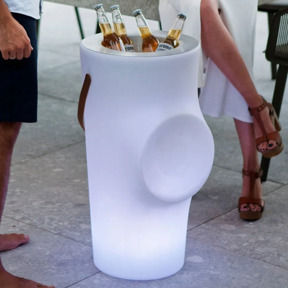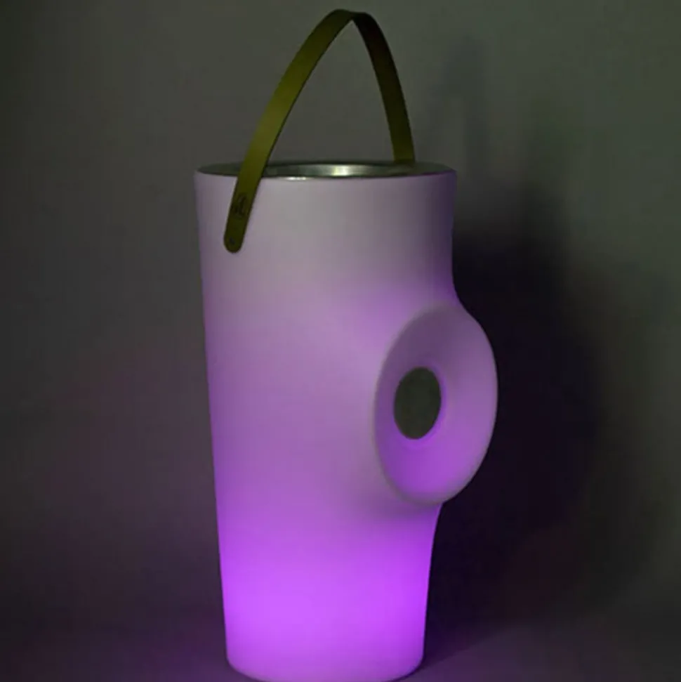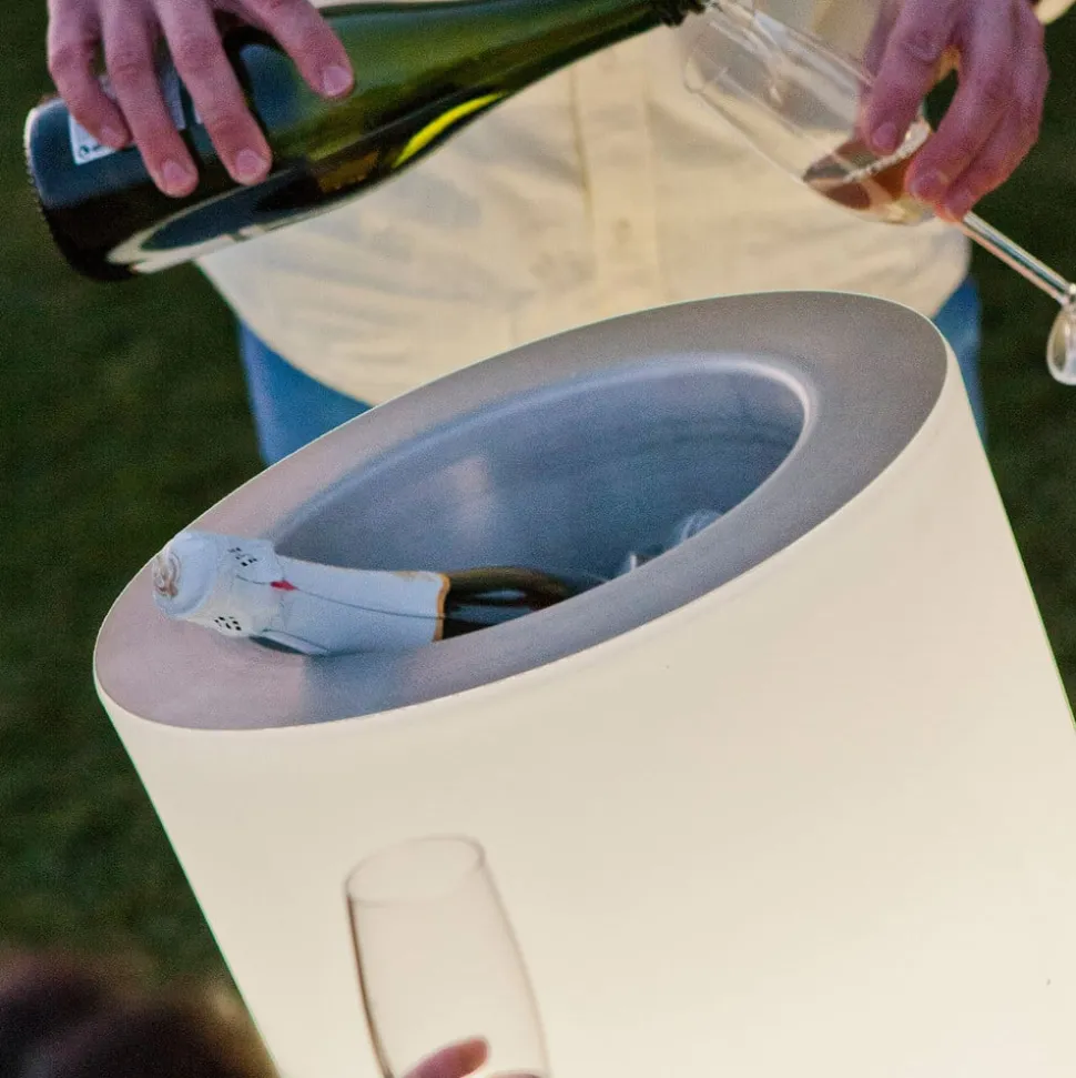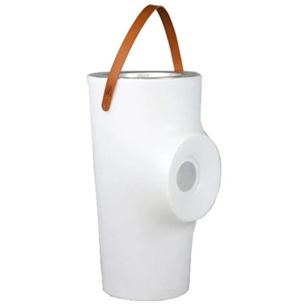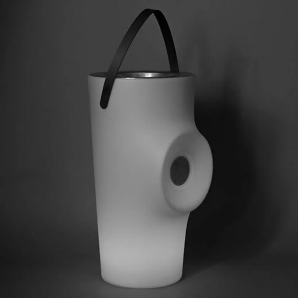 Woody LED flessenkoeler met geïntegreerde luidspreker en Akku De Woody flessenkoeler van Newgarden vervult meerdere functies tegelijk: Hij zorgt voor koele drankjes, effectieve verlichting en de juiste muziek voor elk evenement. De polyethyleen koeler is ontworpen door ontwerper Valerio Sommella. Das polyethyleen materiaal maakt het tot een robuust verlichtingsobject dat gebruikt kan worden bij temperaturen van -45 tot 55 °C en via Bluetooth afspeellijsten kan afspelen van een smartphone, Tablet of ander apparaat. De behuizing van de koeler kan worden verlicht in kleur of wit dankzij de geïntegreerde LED’s, en de lichtinstellingen en luidsprekerinstellingen kunnen worden bediend met de meegeleverde afstandsbediening. De verlichte flessenkoeler met luidspreker kan overal buiten 8 tot 10 uur onafhankelijk worden gebruikt zonder vervelende kabels, en de lege Akku kan binnen 4 tot 6 uur aan het stopcontact worden opgeladen met de meegeleverde oplaadkabel. De praktische draaggreep, die ook een mooi decoratief element is, is gemaakt van kunstleer, terwijl het bijgeleverde inzetstuk van aluminium is – 1500 mAh lithiumbatterij – Licht-/werkingstijd 8 tot 10 uur, afhankelijk van de instelling – Oplaadtijd 4 tot 6 uur