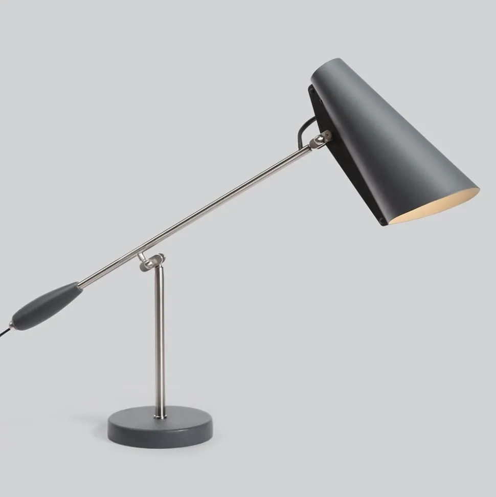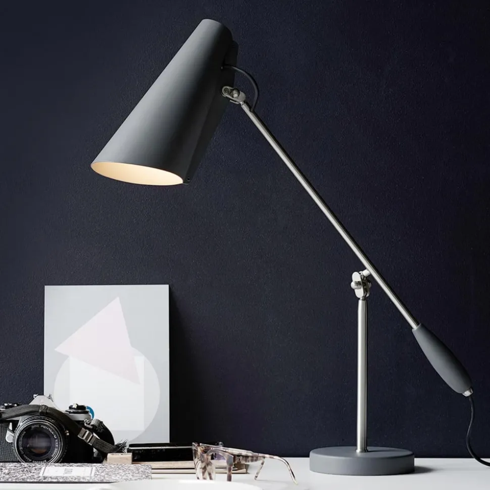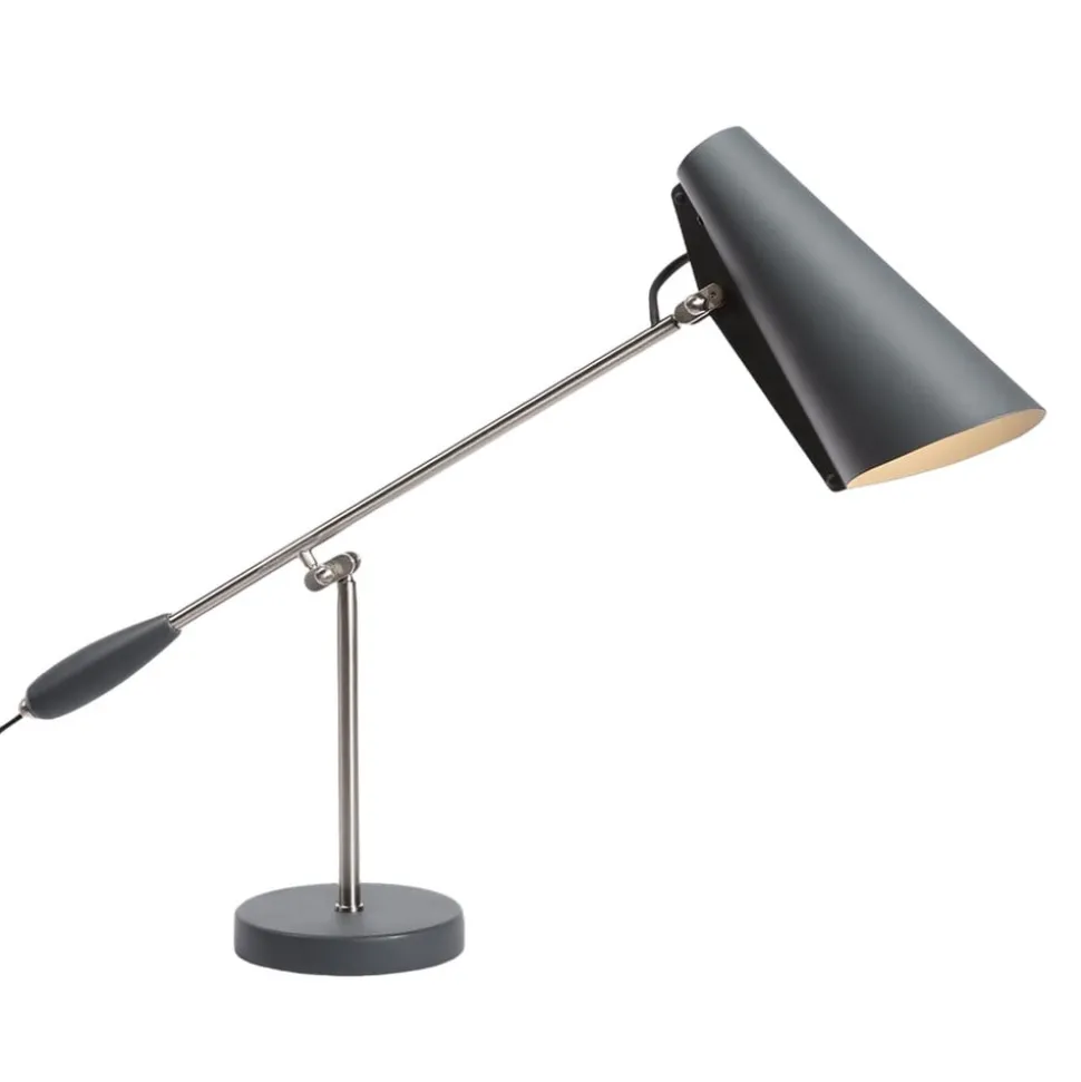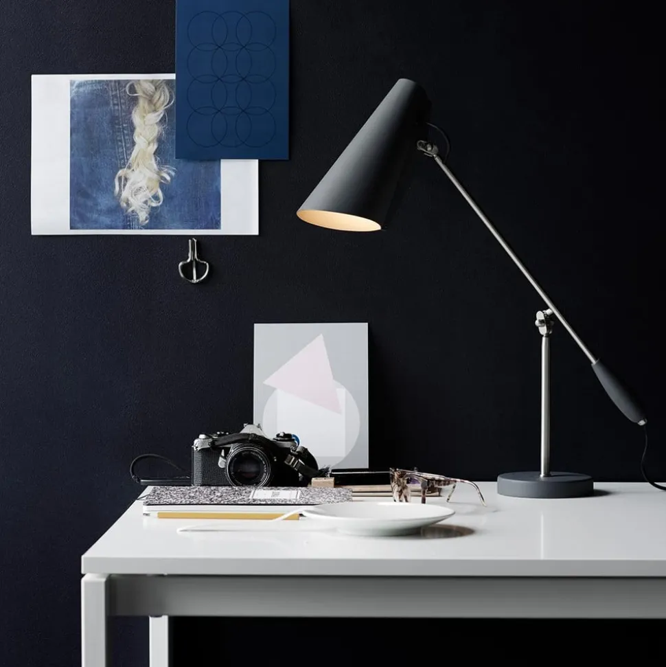 Design tafellamp Birdy in retrostijlDe geboorte van Birdy gaat terug tot 1952, toen de Noorse ontwerper Birger Dahl (1916-1998) de lampenserie Birdy creëerde. Heldere geometrische vormen zonder decoratieve details en versieringen zijn het handelsmerk van Dahl. Bij Birdy betekent dit dat de kap bestaat uit een eenvoudige aluminium kegel en wordt vastgehouden door een slank frame met twee praktische scharnieren. De tafellamp, die perfect geschikt is als bureaulamp, is één keer verstelbaar bij de kap en één keer in het midden van het frame. Producten in de typische jaren 50 en 60 stijl zoals de Birdy tafellamp zijn tegenwoordig weer trendy. Het purisme dat ten grondslag ligt aan deze stijl en vooral aan de stijl van Birger Dahl is de beste basis om het product er altijd modern uit te laten zien.