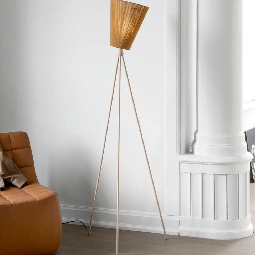 Op het filigrane, beige-kleurige stalen driepootsframe zit een licht transparante tint van karamelkleurig textiel. Het bijzondere aan deze kap is dat hij een gimbalring heeft en dus in alle richtingen kan worden gezwenkt – vergelijkbaar met een schijnwerper. Het lichteffect en de schaduw van Oslo Wood is echter allesbehalve een schijnwerper. Het licht wordt zachtjes verspreid en doet, zoals ontwerper Ove Rogne beweert, denken aan de lichten van de stad Oslo, die op een donkere winteravond zachtjes gefilterd worden door de bomen in het centrum van de stad en verstrooid worden in de donkere nachtelijke hemel.