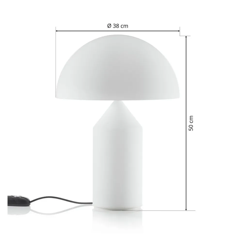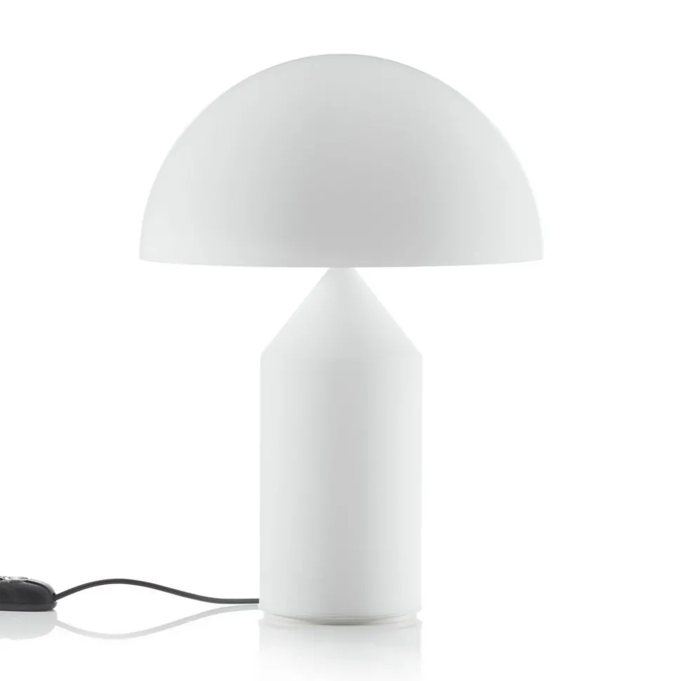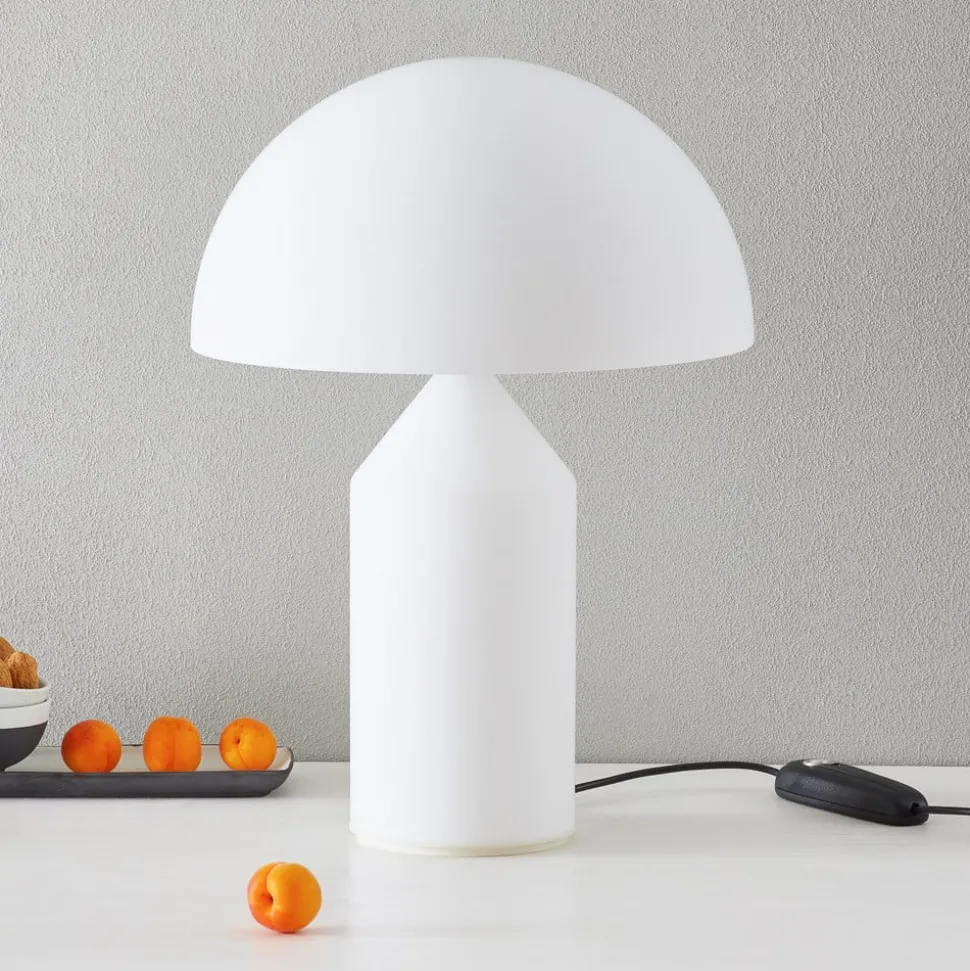Het eerste ontwerp van de Atollo tafellamp dateert van 1977, en ook vandaag heeft het nog niets van zijn charme verloren. In de loop der jaren heeft het talrijke prijzen gewonnen en het is als designklassieker te vinden in vele musea over de hele wereld. De lamp met de karakteristieke paddestoelvorm oogt zeer licht en zorgeloos dankzij het opaalwitte ontwerp en het gebruik van Murano-glas. In totaal twee lichtbronnen – één in de voet en één in de kap – zorgen voor een gelijkmatig direct en diffuus licht. Individuele stemmingen in de ruimte kunnen worden gecreëerd door het licht te dimmen.