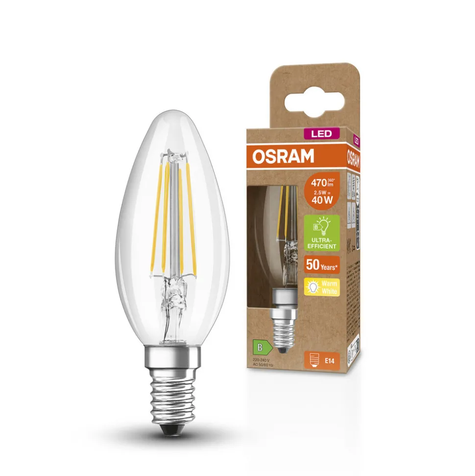 LED kaars Classic E14 2,5W met zichtbare gloeidraden, 2.700 KDeze LED kaars Classic voor E14 fittingen met 2,5W van OSRAM is een energiezuinig alternatief voor conventionele gloeilampen. Deze heeft een vergelijkbaar vermogen van 40 W en een zeer hoge efficiëntie van tot wel 188 lm/W. Met een gemiddelde levensduur van 50.000 uur en een aantal van 500.000 schakelcycli is deze bijzonder duurzaam.De lichtbron is verkrijgbaar in de klassieke minikaarsvorm en heeft een heldere glazen behuizing met zichtbare gloeidraden die een warmwitte lichtkleur produceren van 2.700 K. Deze is ideaal voor decoratieve armaturen. Ideaal voor decoratieve armaturen, huishoudelijke toepassingen en algemene verlichting. Bij gebruik buitenshuis mag hij alleen worden gebruikt in buitenarmaturen met minimaal IP65.Speciale kenmerken:- extreem goede schakelbestendigheid: 500.000 schakelcycli- goede gemiddelde levensduur: 50.000 uurAantekening: niet dimbaar.