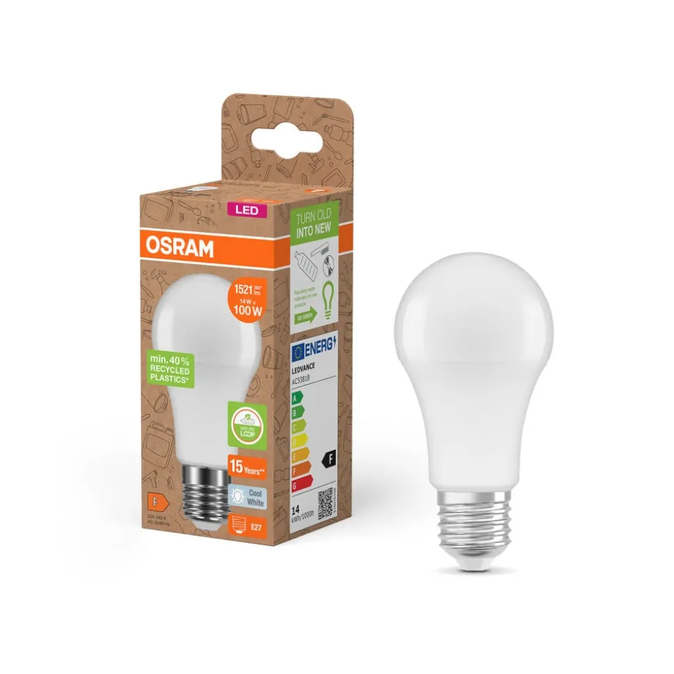 Gemaakt van gerecycled plastic: OSRAM Classic Star LED lichtbron, E27, 14 W, 4.000 K De Classic Star LED lichtbron met E27 lampvoet produceert universeel wit licht en maakt ook indruk met zijn klassieke retrofitformaat en mat oppervlak. Omdat er geen UV- of nabij-infraroodcomponenten in de lichtstraal zitten, is deze lichtbron ideaal voor het verlichten van warmtegevoelige objecten zoals voedsel of planten. Classic Star is gemaakt van minstens 40% gerecycled kunststof, produceert onmiddellijk 100% licht zonder opwarmtijd en is een universeel toepasbare LED lamp.