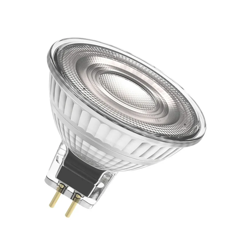 OSRAM LED reflectorlamp GU5.3 MR16, 2,6 W, 2700 K, 12 V, 120° Deze LED reflectorlamp voor laagspanningsarmaturen met GU5.3 fitting produceert warmwit licht dat door het heldere, loodvrije glas wordt uitgestraald. Omdat er geen UV- of nabij-infraroodcomponenten in de lichtbundel zitten, is deze lichtbron ideaal voor het verlichten van warmtegevoelige objecten zoals voedsel of planten. Deze LED lamp produceert onmiddellijk 100% licht zonder opwarmtijd en wordt aanbevolen voor eenvoudige vervanging van conventionele laagspanningshalogeenlichtbronnen. Technische kenmerken: – Aangenaam warmwitte lichttemperatuur (2..700 K) – Vergelijkingswaarde: 20 W (ten opzichte van conventionele lichtbronnen) bij slechts 2,6 W – Goede schakelstabiliteit: 100.000 schakelcycli – Lichtemissie zonder UV- en nabij-infraroodcomponenten: geschikt voor het verlichten van warmtegevoelige objecten – Eenvoudige vervanging van halogeenlampen dankzij compact ontwerp, glazen behuizing en enkele lens Opmerkingen: – Alleen geschikt voor laagspanningslampen (12 volt) – Niet dimbaar