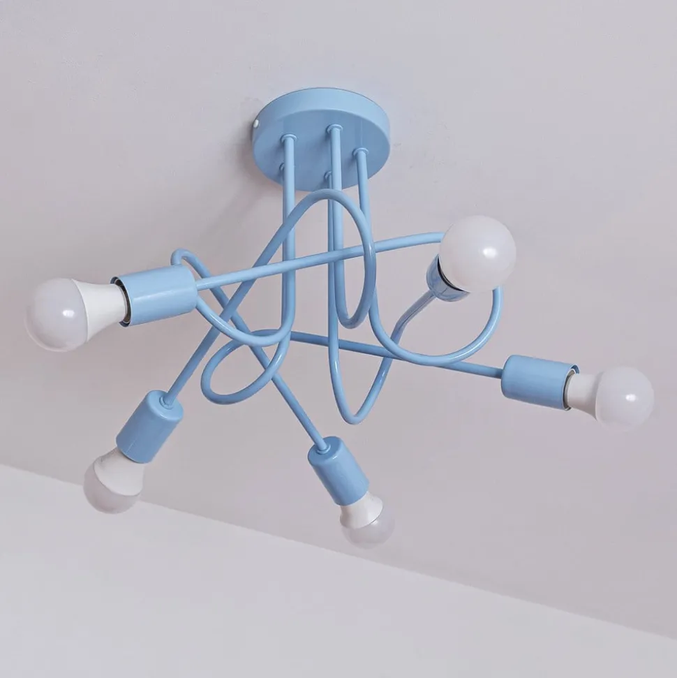 5-lamps Oxford plafondlamp in lichtblauw De Oxford plafondlamp in lichtblauw metaal combineert stijlvol design met functionele verlichting. De vijf lampenarmen reiken van de ronde baldakijn naar beneden in de kamer en wijzen in verschillende richtingen, zodat zelfs grote kamers helder verlicht worden vanuit elke hoek met deze plafondlamp. De Oxford plafondlamp is uitgerust met een gestandaardiseerde E27 fitting en maakt het mogelijk om de LED plafondlamp eenvoudig te vervangen, wat bijdraagt aan een efficiënt energieverbruik. De robuuste metalen constructie zorgt voor duurzaamheid en past harmonieus in verschillende inrichtingsstijlen. De Oxford plafondlamp is daarom een ideale keuze voor wie waarde hecht aan kwaliteit en esthetische verscheidenheid.