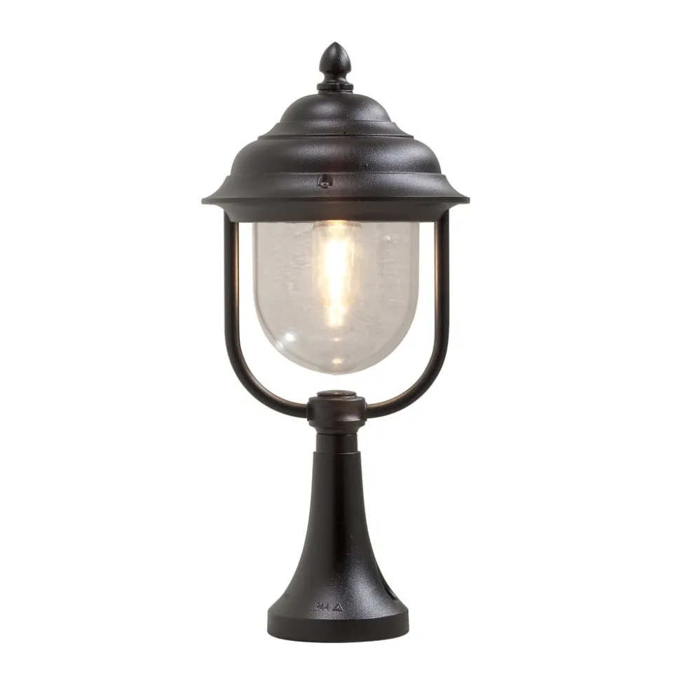 De Parma sokkellamp creëert een stijlvolle sfeer buitenshuis Parma is een klassieke sokkellamp van aluminium met helder kap. De mooi gevormde kap en decoraties geven de lamp een licht nostalgisch effect.