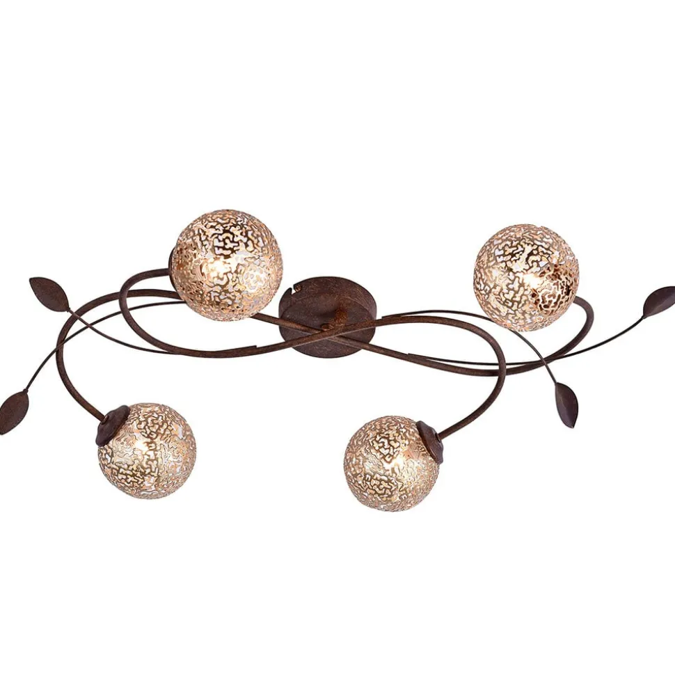 Greta – een 4-lamps plafondlamp met bloemelementen In een harmonieuze kleurencombinatie is plafondlamp Greta gemaakt van staal met een roest-look afwerking en goudkleurig gelakt metaal en heeft een licht bloemmotief. Niet alleen draaien de lampenarmen vanuit de baldakijn naar buiten, maar er zijn ook twee ranken met mooie bladeren aan het uiteinde. De bolvormige kappen zijn gemaakt van metaal met een prachtig uitgestanst patroon. De Greta plafondlamp creëert een uniek lichtspel op zowel het plafond als in de kamer, omdat het licht alleen door de kappen naar buiten komt via de uitsparingen, waardoor een effectief licht- en schaduweffect ontstaat.