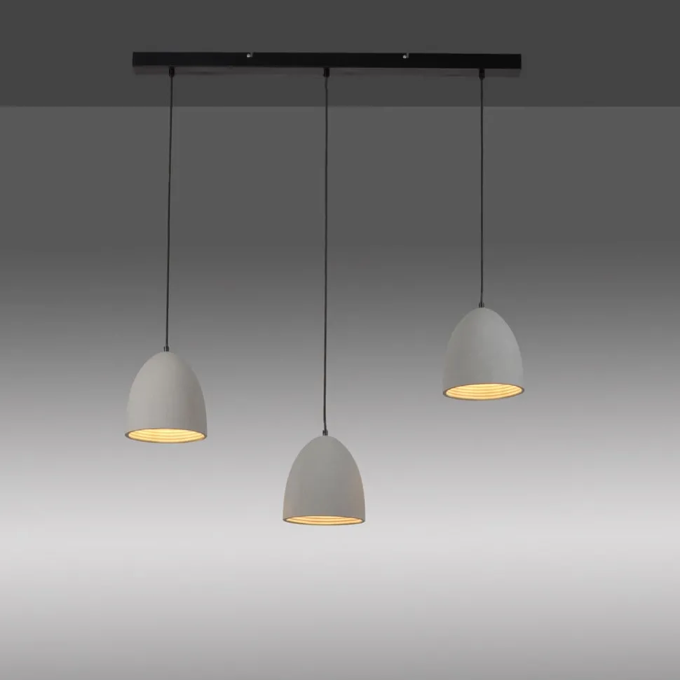 3-lamps balk hanglamp Eton met betonnen kappen De drie kappen van de Eton hanglamp zijn gemaakt van beton in de vorm van semi-ovalen. Ze hangen aan een lange, zwart gelakte baldakijn en kunnen op verschillende hoogtes worden gemonteerd of in een lijn worden afgehangen. Het betonnen materiaal, in combinatie met de zwarte baldakijn en zwarte kabels, maakt de lamp een perfecte match voor een moderne of industriële woonomgeving, bijvoorbeeld boven een langwerpige eettafel of aanrecht.