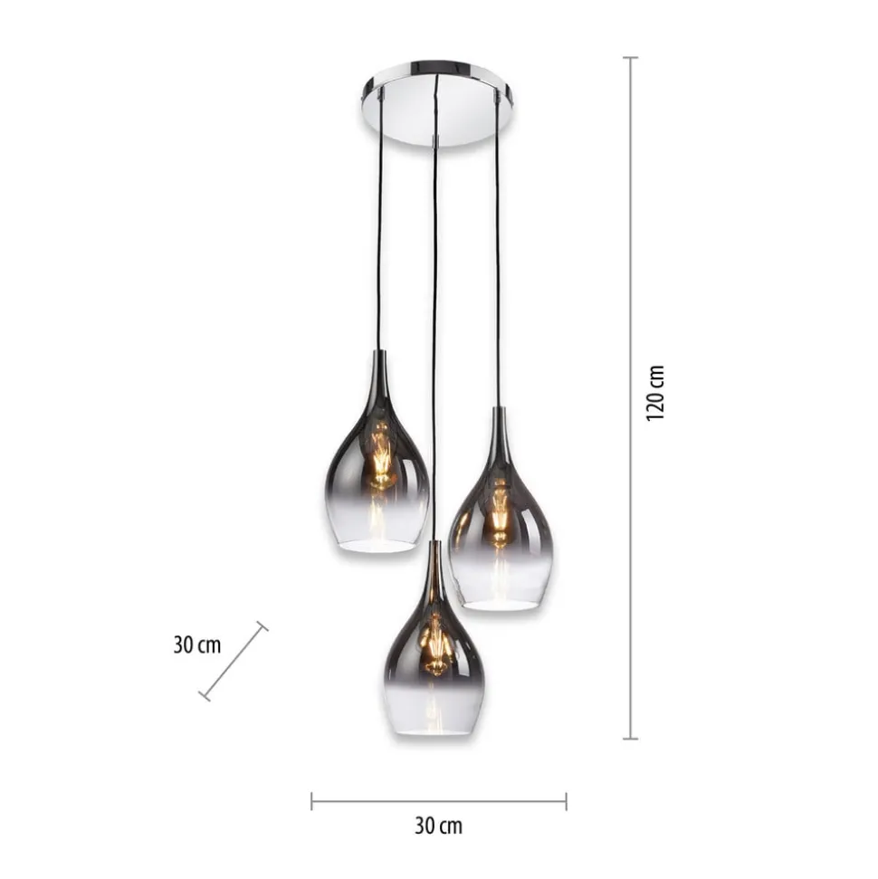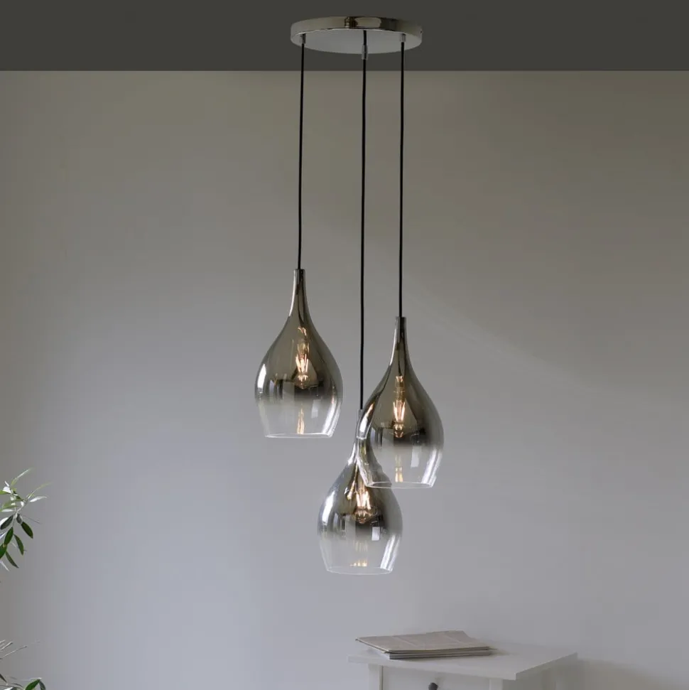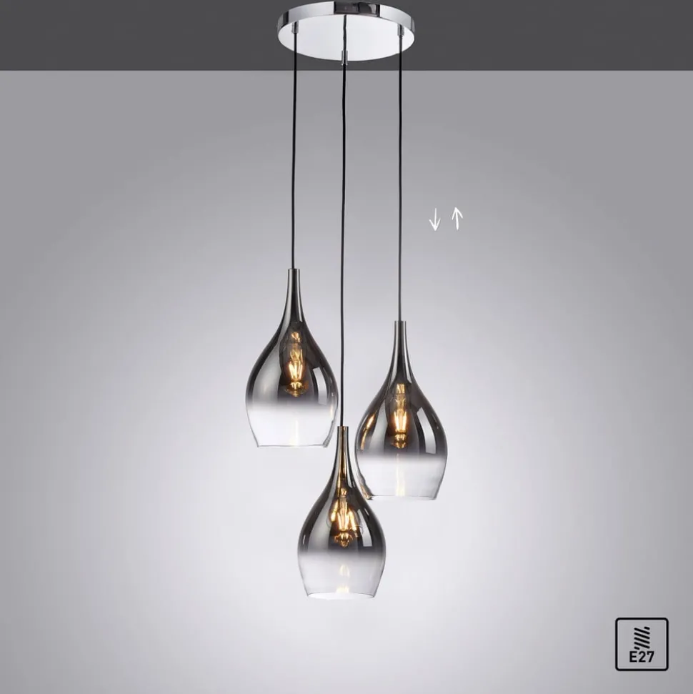 Hanglamp Pilua met rookgrijze glazen kap Deze prachtige hanglamp Pilua is bijzonder geschikt voor installatie boven een ronde eettafel. Ze past perfect bij moderne inrichtingsstijlen. De ronde baldakijn van de hanglamp is gekleurd met een geraffineerde chromen kap. De drie druppelvormige kappen zijn in verschillende lengtes aan de baldakijn bevestigd en hebben een kleurverloop van rokerig grijs naar wit – waardoor de lamp een hoogtepunt in je huis wordt. De lamp is voorzien van drie E27 lampen (niet inbegrepen)