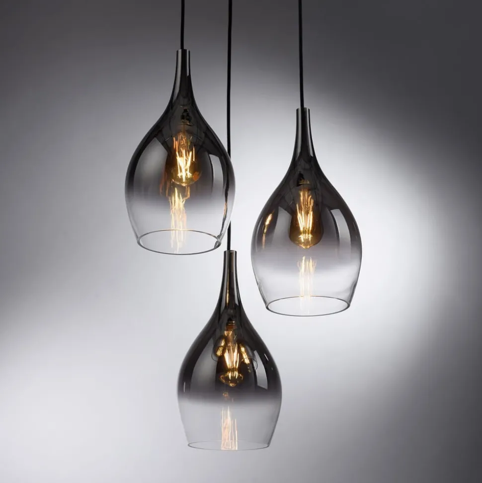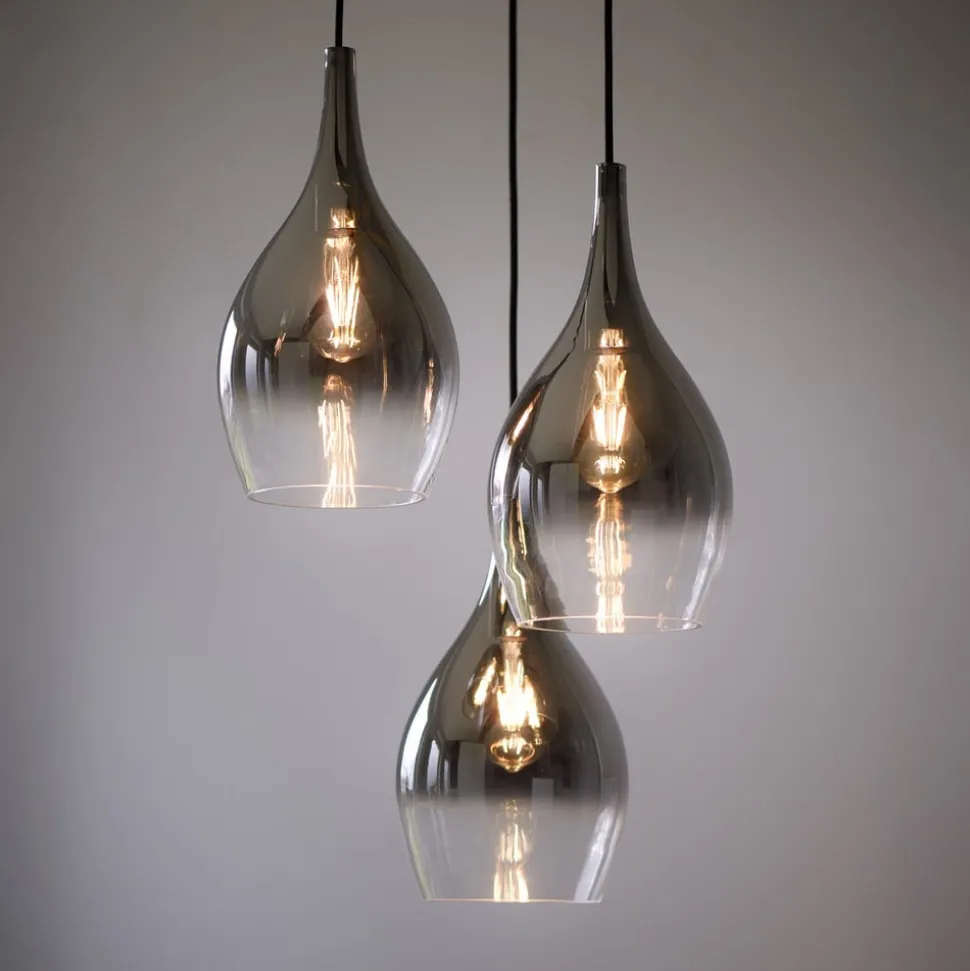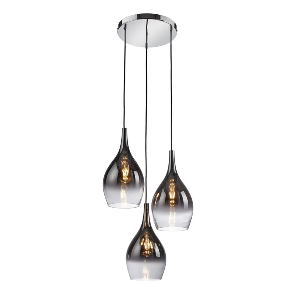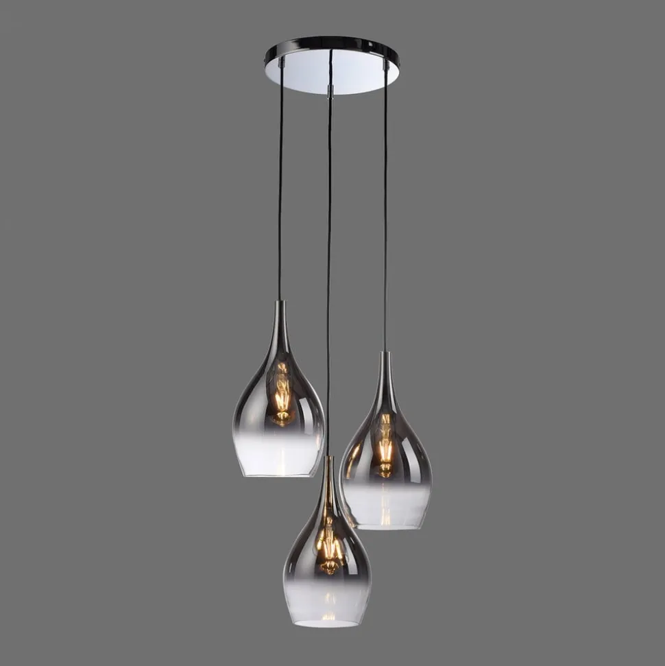 Hanglamp Pilua met rookgrijze glazen kap Deze prachtige hanglamp Pilua is bijzonder geschikt voor installatie boven een ronde eettafel. Ze past perfect bij moderne inrichtingsstijlen. De ronde baldakijn van de hanglamp is gekleurd met een geraffineerde chromen kap. De drie druppelvormige kappen zijn in verschillende lengtes aan de baldakijn bevestigd en hebben een kleurverloop van rokerig grijs naar wit – waardoor de lamp een hoogtepunt in je huis wordt. De lamp is voorzien van drie E27 lampen (niet inbegrepen)