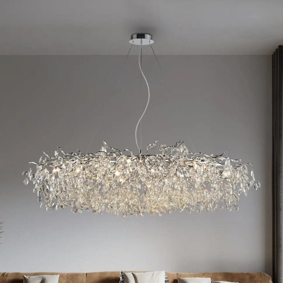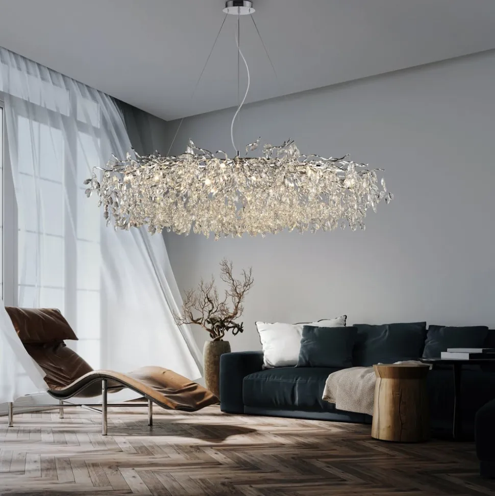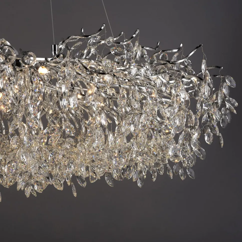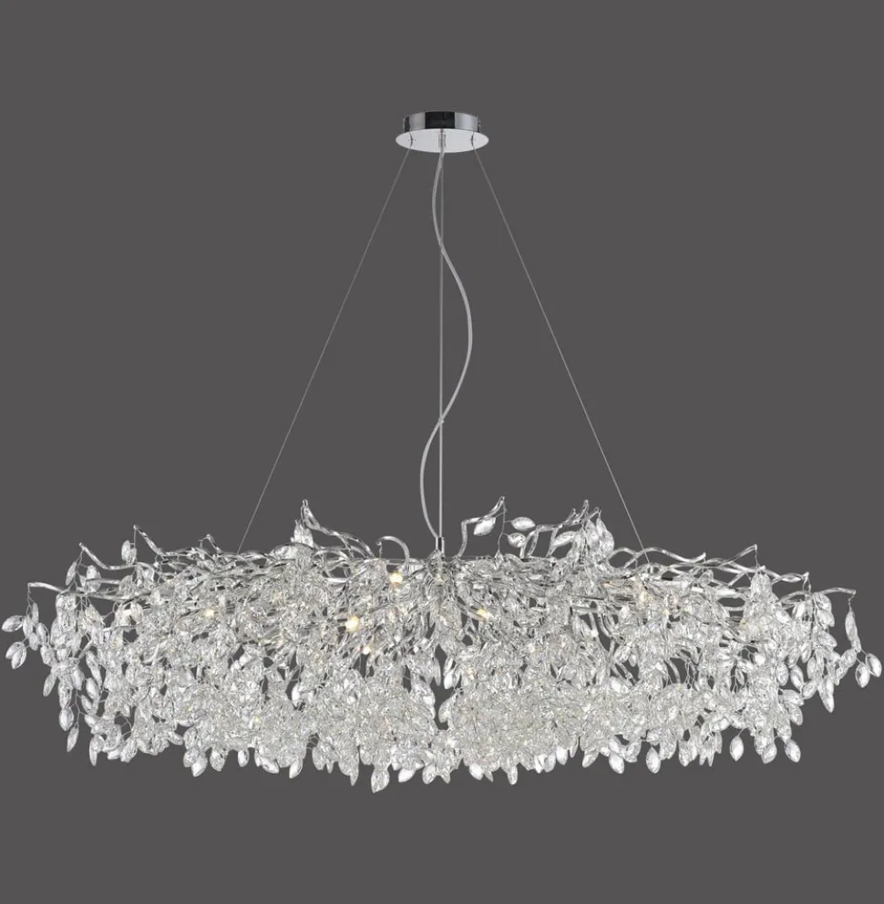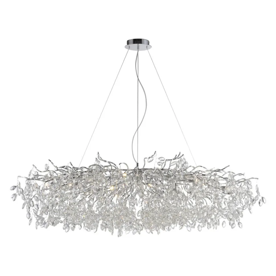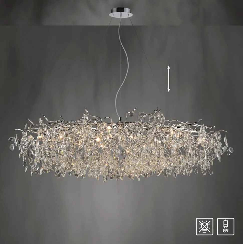 Kroonluchter Ricicle van verchroomd metaal met kristallen pegels De kroonluchter Ricicle ziet er luxueus en elegant uit in elke kamer, of het nu een woonkamer, hal, hotellobby of hal is. De elegante kroonluchter van glanzend verchroomd metaal is voorzien van ontelbare strengen sprankelende kristallen pendants en presenteert een adembenemend lichtspel dat elke kamer zal betoveren. De pompeuze aanwezigheid en exclusieve uitstraling maken de kroonluchter tot een elegante blikvanger in elke ruimte. De kroonluchter is uitgerust met G9 fitting, die zowel met LED lampen als met halogeenlampen gebruikt kan worden om zo energiezuinig mogelijk te zijn. De glazen kristallen pegels weerkaatsen het licht op een fascinerende manier en creëren een uitnodigende en schitterende sfeer.