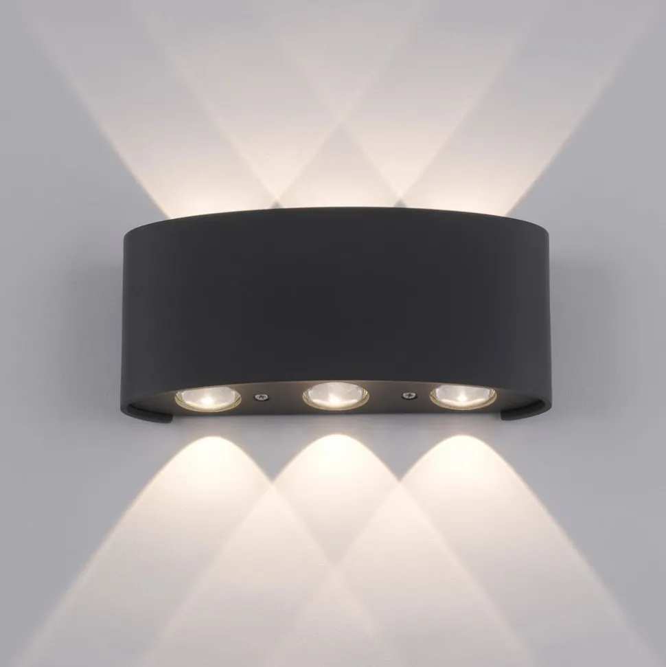 Carlo LED buiten wandlamp met uplight en downlight, spatwaterdicht De antracietkleurige Carlo LED wandlamp maakt indruk met haar moderne en eenvoudige look. De drie lampen die boven en onder aan het halfronde armatuur zijn gemonteerd, stralen grote lichtbundels uit die elkaar decoratief overlappen, waardoor een mooi, decoratief licht ontstaat. Er zijn in totaal zes permanent geïnstalleerde, warmwitte LED’s. Dankzij de LED technologie wordt het armatuur gekenmerkt door zijn energiebesparende ontwerp en overtuigt het door zijn lage warmteontwikkeling en lange levensduur. Dankzij de beschermingsgraad IP54 is de wandlamp geschikt voor zowel binnen- als buitengebruik. Creëer een indrukwekkend accent in huis met de moderne LED wandlamp. De ideale lamp voor binnen en buiten. Gebruik de lamp om een speciale blikvanger te creëren op de muren van je huis, in gangen of bij de ingang.