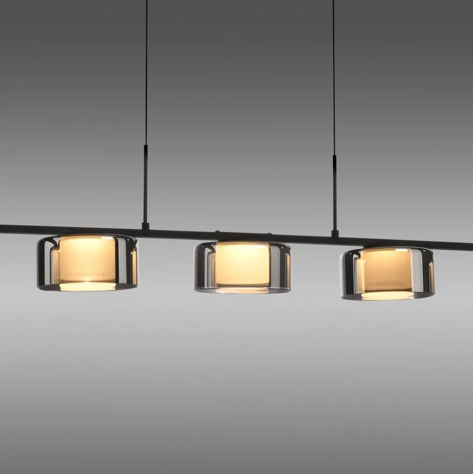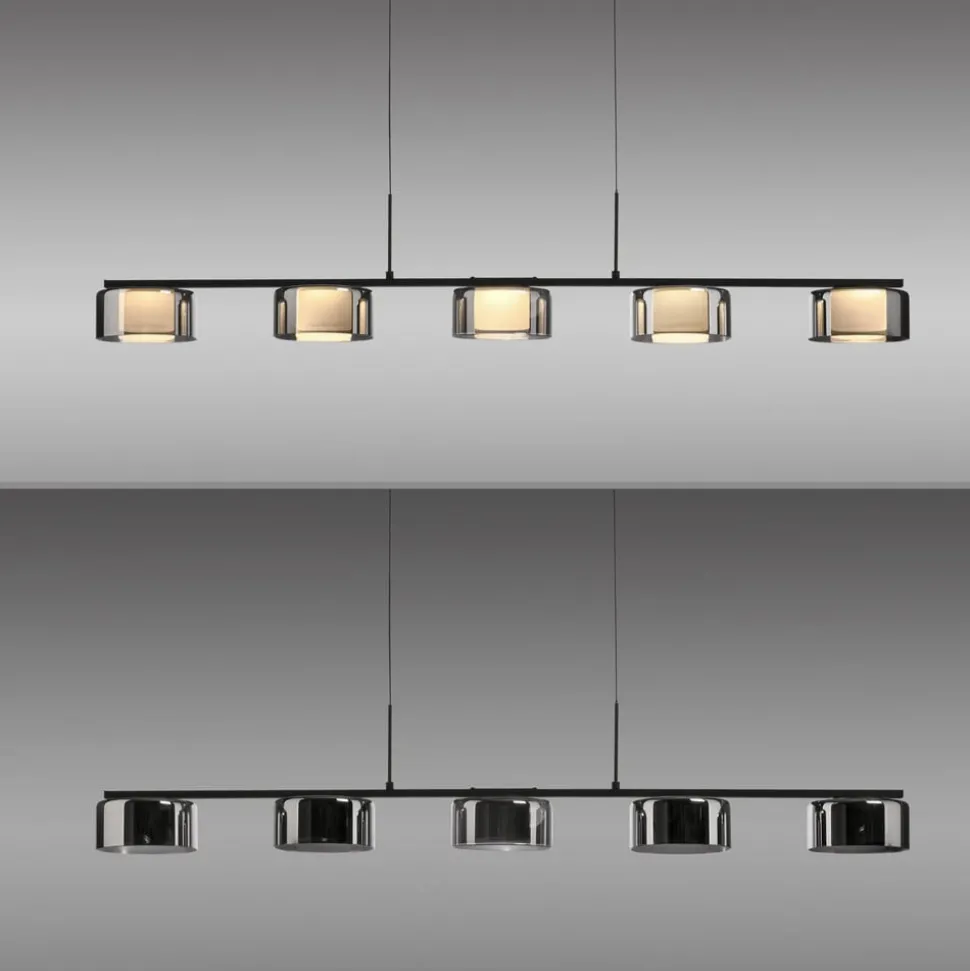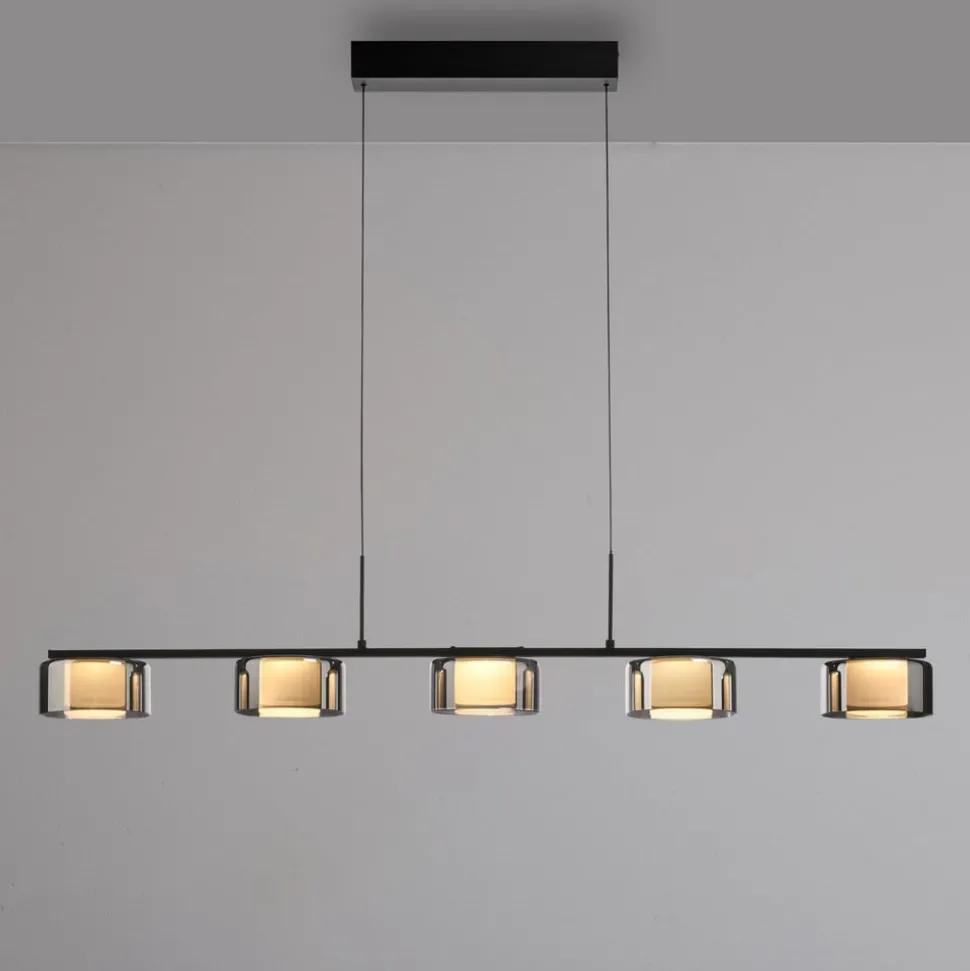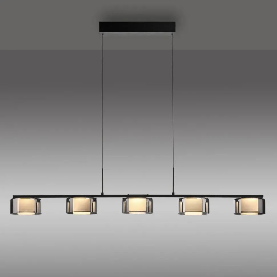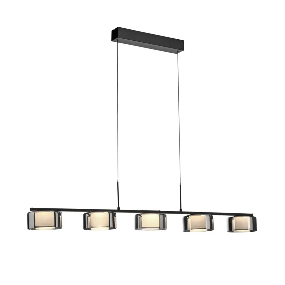 Rika LED hanglamp van glas met Comfort-Lift en SimplyDim technologie De zwarte LED hanglamp maakt indruk met haar moderne, eenvoudige ontwerp. Dankzij de vijf kappen van gerookt glas en de warmwitte LED lampen straalt de lamp een zacht licht uit en creëert ze een uitnodigende sfeer boven je eettafel. De Comfort-Lift functie maakt het eenvoudig om de hoogte te verstellen. Dankzij het mechanisme dat in de baldakijn is ingebouwd, zijn vervelende tegengewichten niet langer een probleem. Met de hoogteverstelling kun je de hoogte van de lamp snel en eenvoudig flexibel aanpassen aan je woonruimte. De hanglamp is ook uitgerust met SimplyDim-technologie. Met deze functie kun je de lichtintensiteit van het armatuur eenvoudig dimmen met de bestaande lichtschakelaar. De dimmertechnologie regelt de lichtsterkte via de schakelimpuls, waardoor het licht traploos kan worden gedimd van 100 % tot 10 % van de lichtintensiteit. Als de lamp minder dan 3 seconden na het uitschakelen weer wordt ingeschakeld, begint het dimproces. Zodra de helderste (100 %) of donkerste (10 %) waarde is bereikt, blijft de lamp ongeveer 2 seconden op deze stand staan voordat het proces opnieuw begint. Als het licht op de gewenste helderheid schijnt tijdens een proces, kunt u de lichtintensiteit opslaan door het licht uit te schakelen. Als je de lamp weer inschakelt, schijnt de lamp op de opgeslagen helderheid en blijft deze instelling behouden. Zo kun je het licht naar wens aanpassen en snel weer oproepen. Plaats de hanglamp boven je eettafel en hul je kamer in een gezellige sfeer.