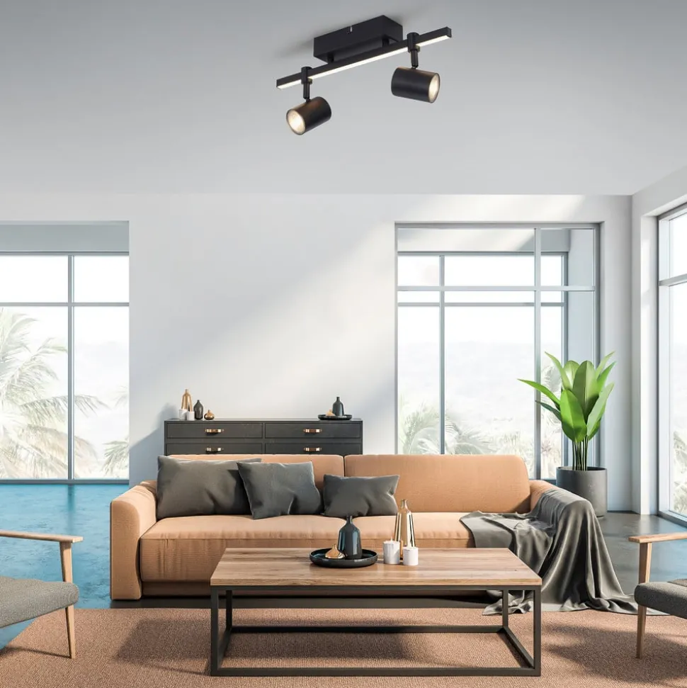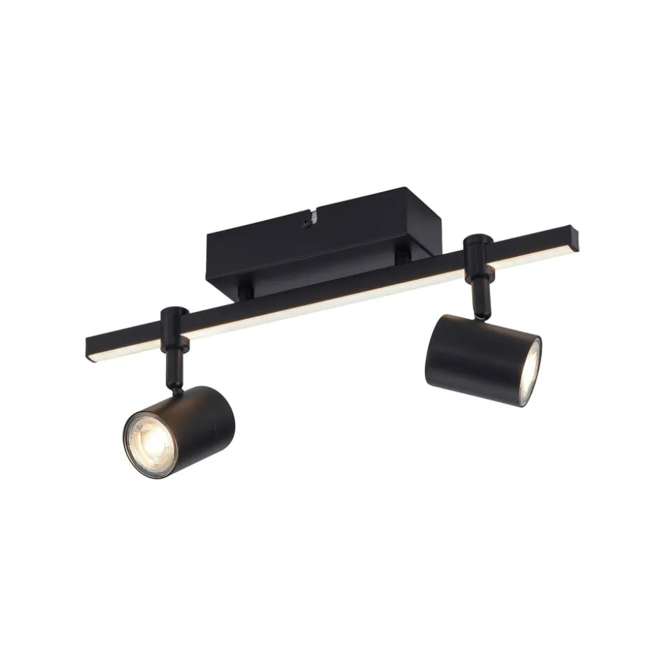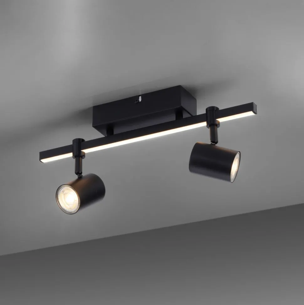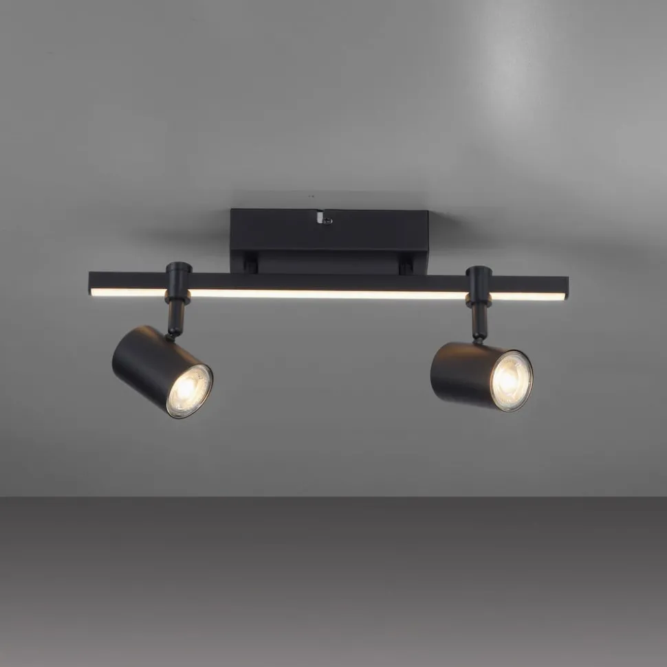 Barik LED plafondspot met twee spots en afzonderlijk schakelbare lichtbronnen De zwarte Barik plafondspot wordt gekenmerkt door een technisch modern design. De twee draaibare spots kunnen flexibel op de rail worden uitgelijnd voor een optimale verlichting in de kamer. De wand- en plafondlamp produceert een aangenaam warmwit licht. De rail is ook uitgerust met een LED-strip, die voor een speciale HighLight zorgt. De geïntegreerde serieschakelaar maakt het mogelijk om beide lichtbronnen samen te activeren, alleen de LED-strip of alleen de spots via de wandschakelaar. Er worden twee GU10 lampen meegeleverd. Dankzij de geheugenfunctie worden de laatste instellingen automatisch opgeslagen. Door de lage afhanghoogte is de lamp ook geschikt voor kamers met lage plafonds.