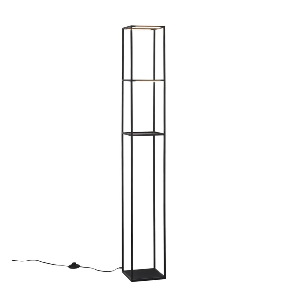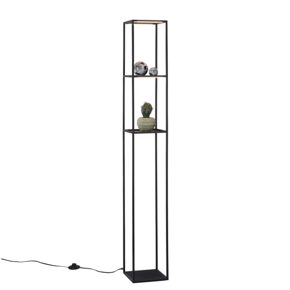 Contura LED vloerlamp in zwart, open ontwerp met twee decoratieve schappen De Contura LED vloerlamp is gemaakt van smalle metalen stutten. In het bovenste gedeelte van de armatuur zijn twee schappen geïntegreerd die kunnen worden voorzien van kleine decoratieve objecten. Deze worden verlicht door de LED’s die boven in de stangen zijn geïntegreerd. Dit betekent dat de vloerlamp steeds opnieuw kan worden ontworpen en gedecoreerd. De Contura vloerlamp is uitgerust met een touchdimmer waarmee het licht van de LED’s op drie helderheidsniveaus kan worden ingesteld. Dankzij de geheugenfunctie wordt de geselecteerde helderheid opgeslagen tot de volgende keer dat de lamp wordt ingeschakeld. Een licht dat nooit verveelt.