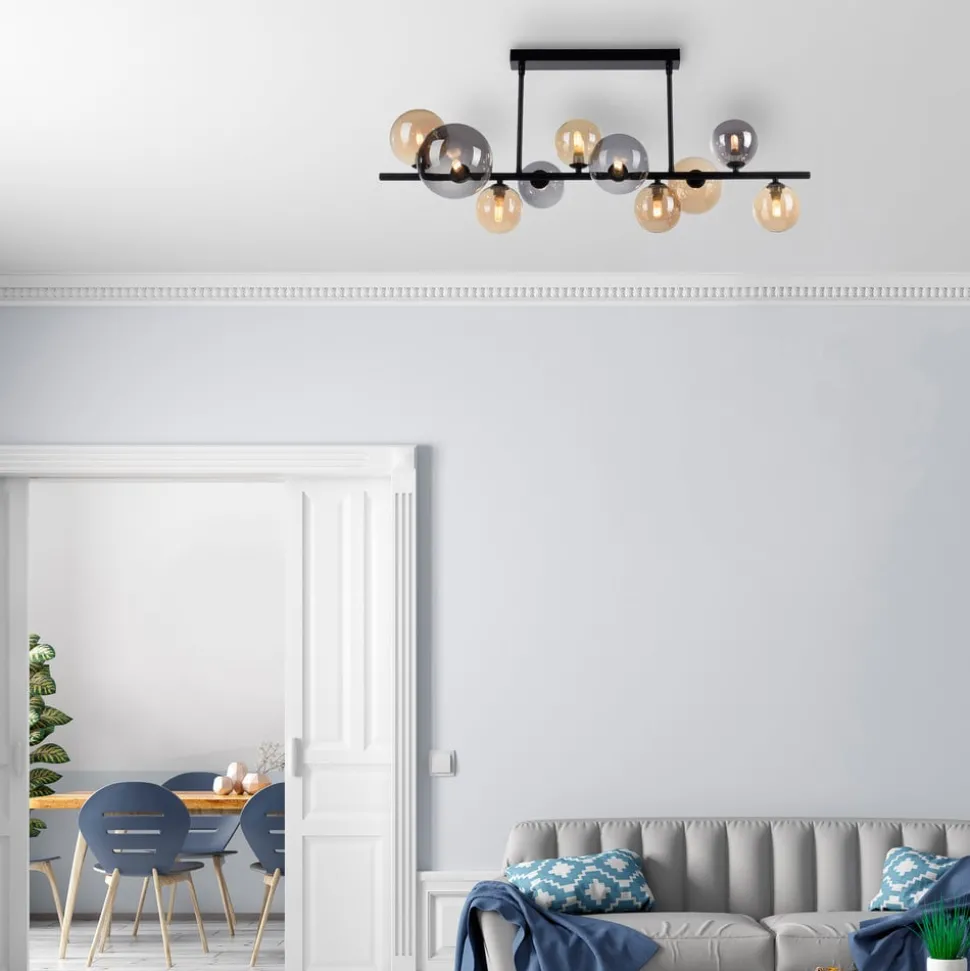 G9 lamp kan worden vervangen: Popsicle plafondlamp met getinte glazen lampenkappen De prachtig ontworpen, zwarte Popsicle plafondlamp met amberkleurige en rookgrijze glazen lampenkappen van verschillende grootte geeft je woonruimte een decoratieve gloed. Ze wordt geleverd met tien warmwitte G9 LED lampen, die een prachtig lichtspel uitstralen door de glazen lampenkappen. Geplaatst boven een eettafel creëert Popsicle een gezellige, huiselijke sfeer.